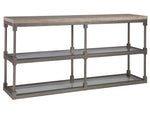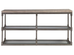 - Transitional Design In Antiqued Silver Leaf Finished Iron Base With A Sand Travertine Top And Tempered Glass Inset Shelf With 1-inch Bevel.
