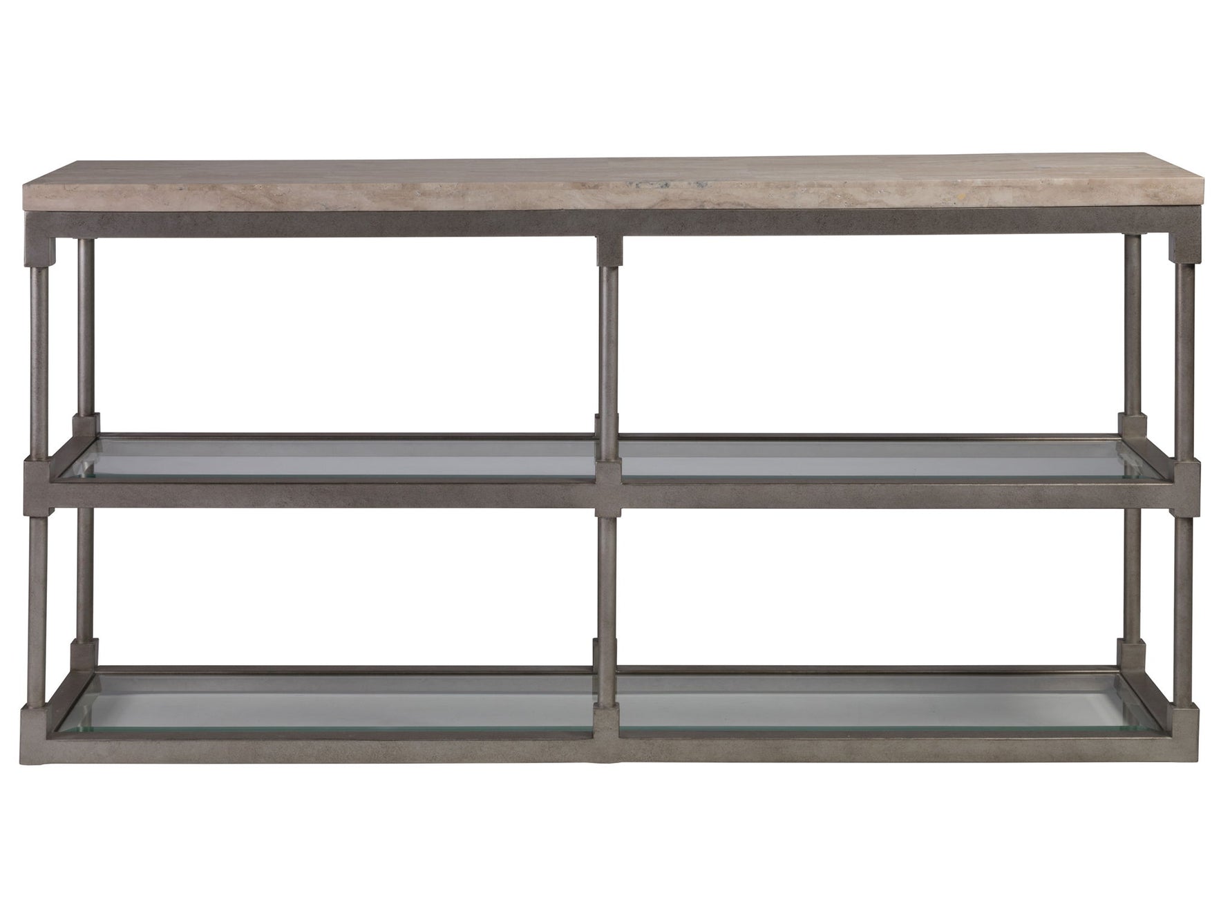 - Iron Base In Antiqued Silver Leaf Finish, Sand Travertine Top, Tempered Glass Inset Shelf With 1 Bevel .