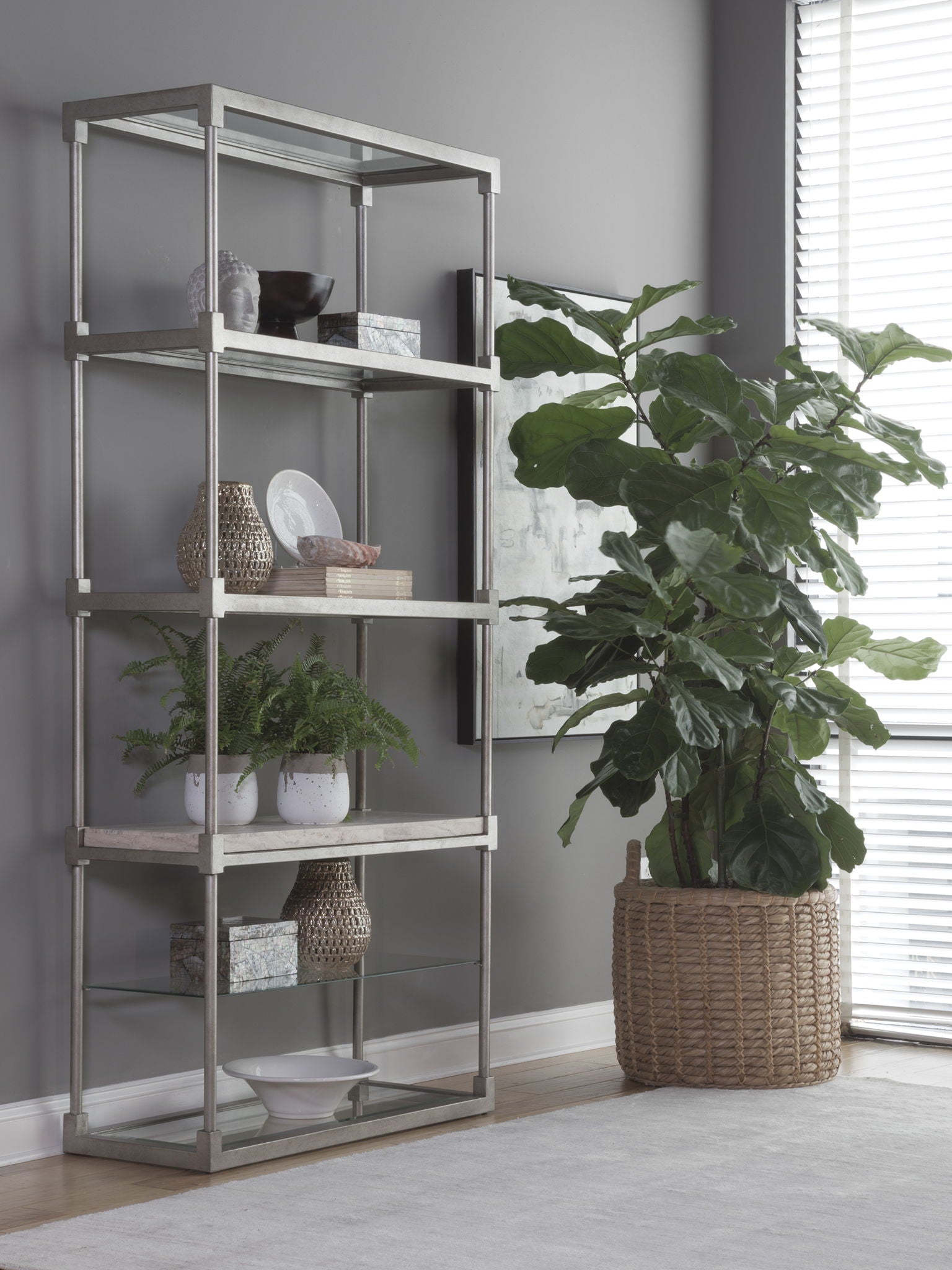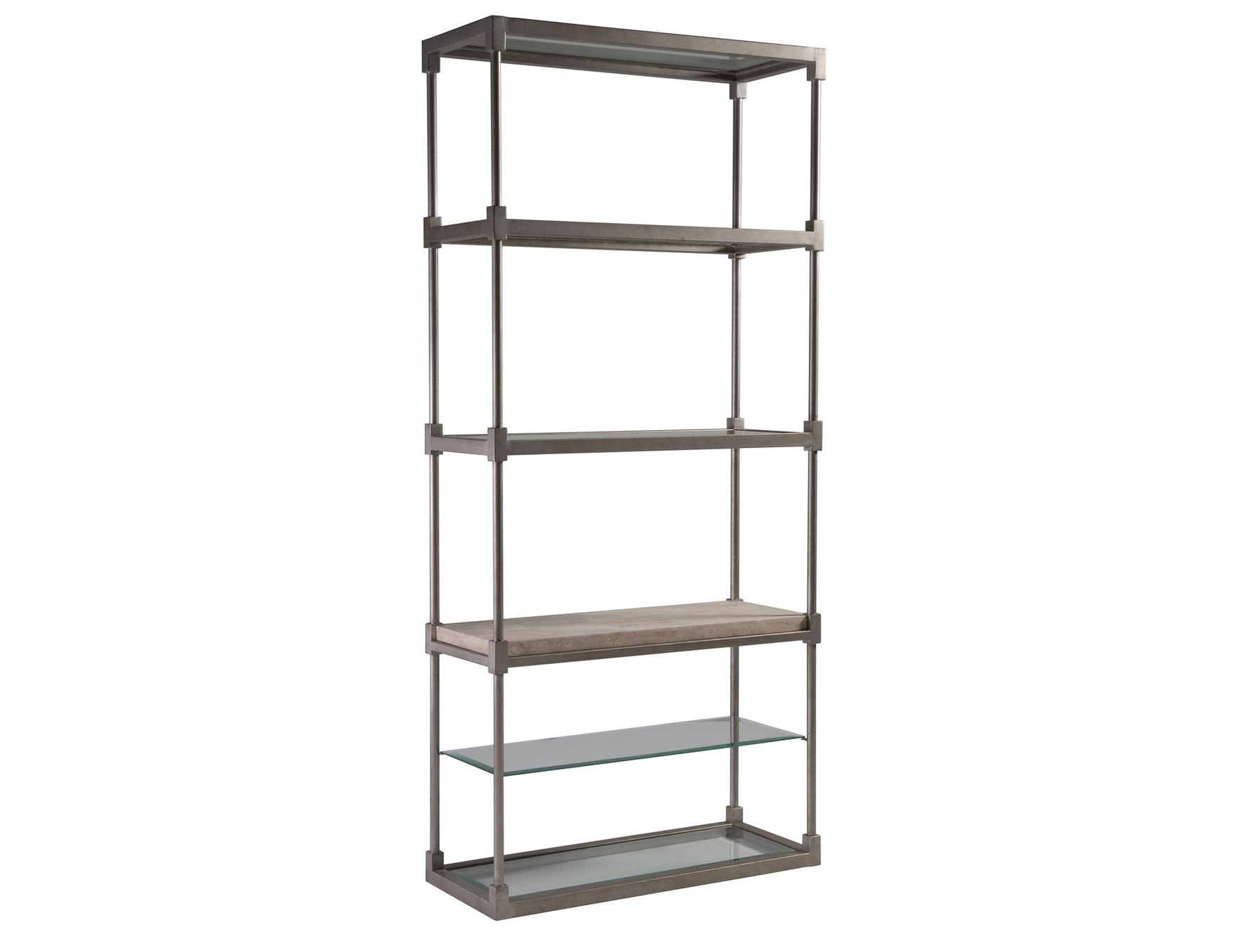 Unit price perTransitional design in antiqued silver leaf finished iron base with a sand travertine shelf and four tempered glass inset shelves with 1-inch bevel.