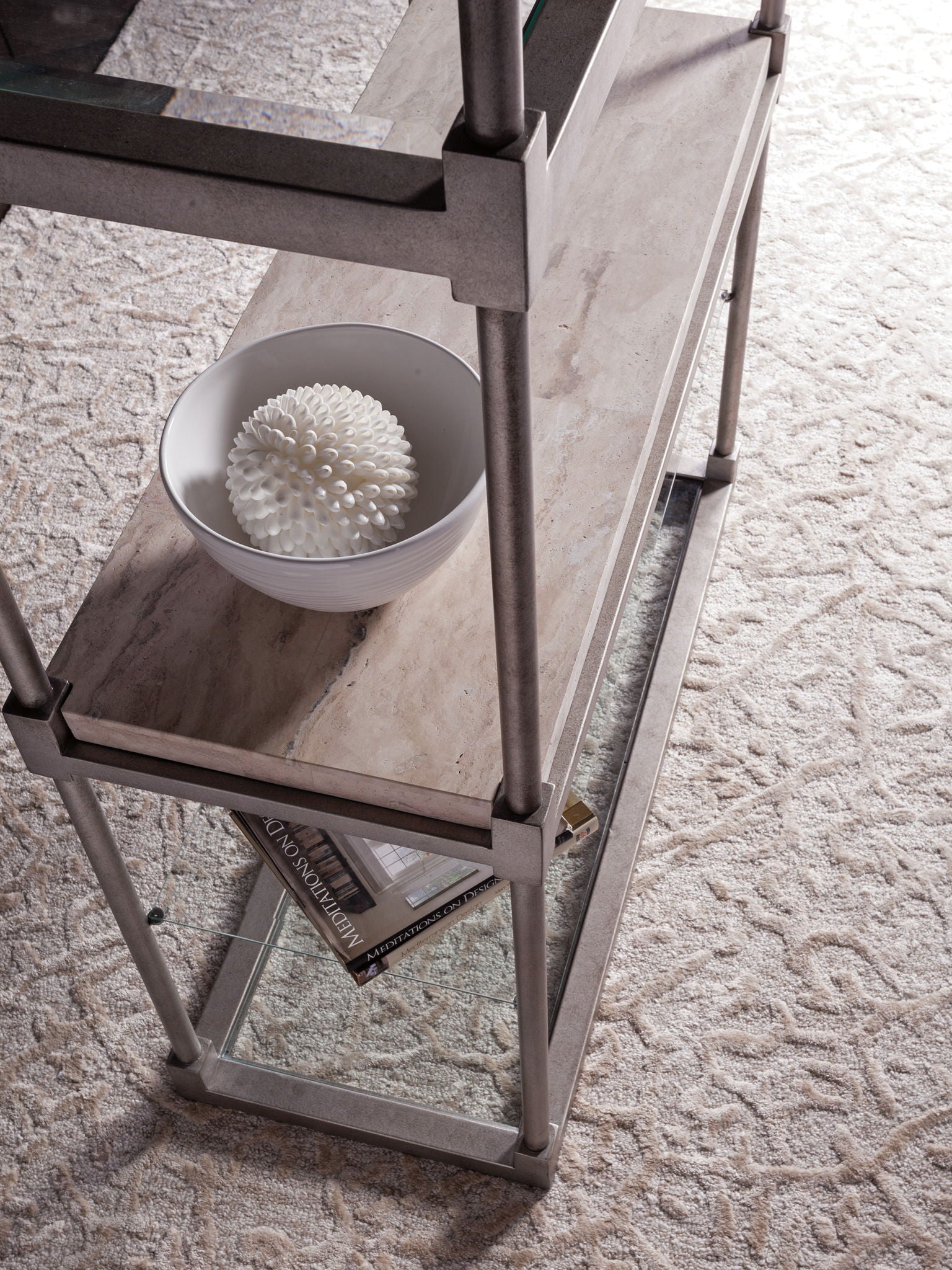 - Iron Base In Antiqued Silver Leaf Finish, Sand Travertine Top, One Sand Travertine Shelf And Four Tempered Glass Inset Shelves With 1 Bevel