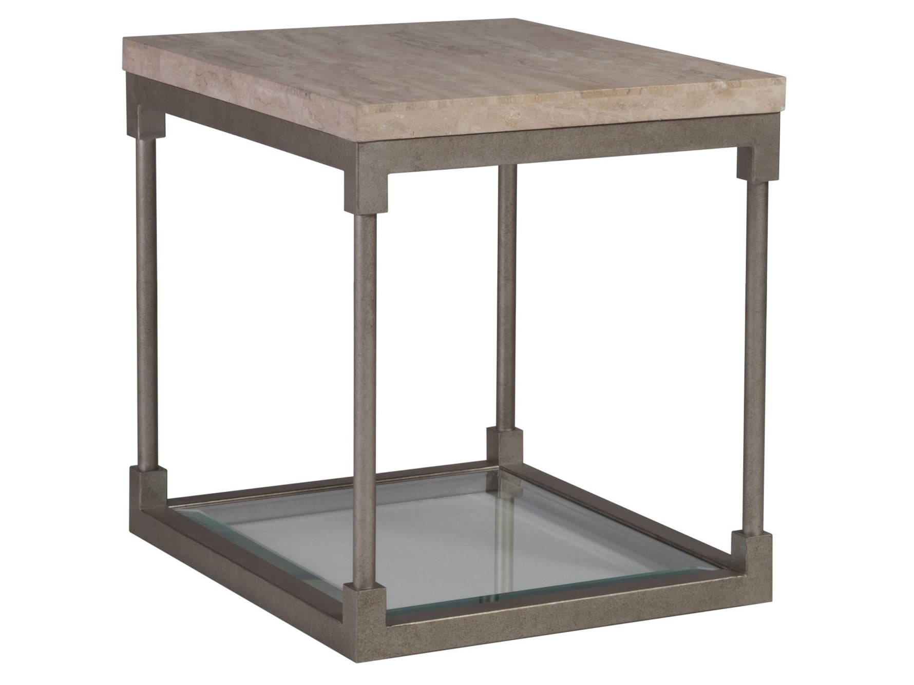 - Iron Base In Antiqued Silver Leaf Finish, Sand Travertine Top, Tempered Glass Inset Shelf With 1 Bevel .