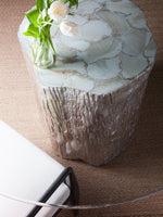 Unit price perNatureform trunk cast and finished in leaf with inlaid fossilized clam shell top paired with a glass top