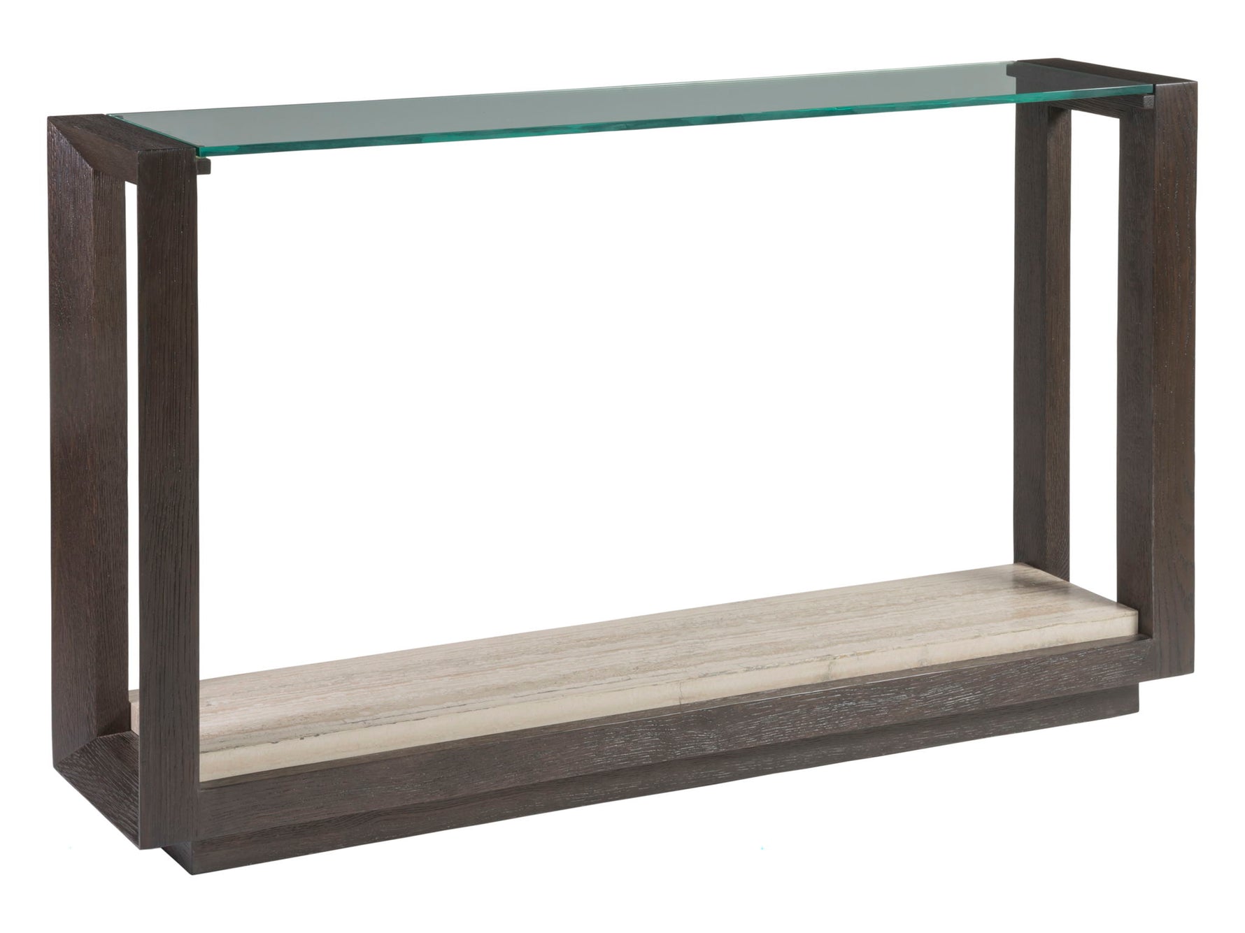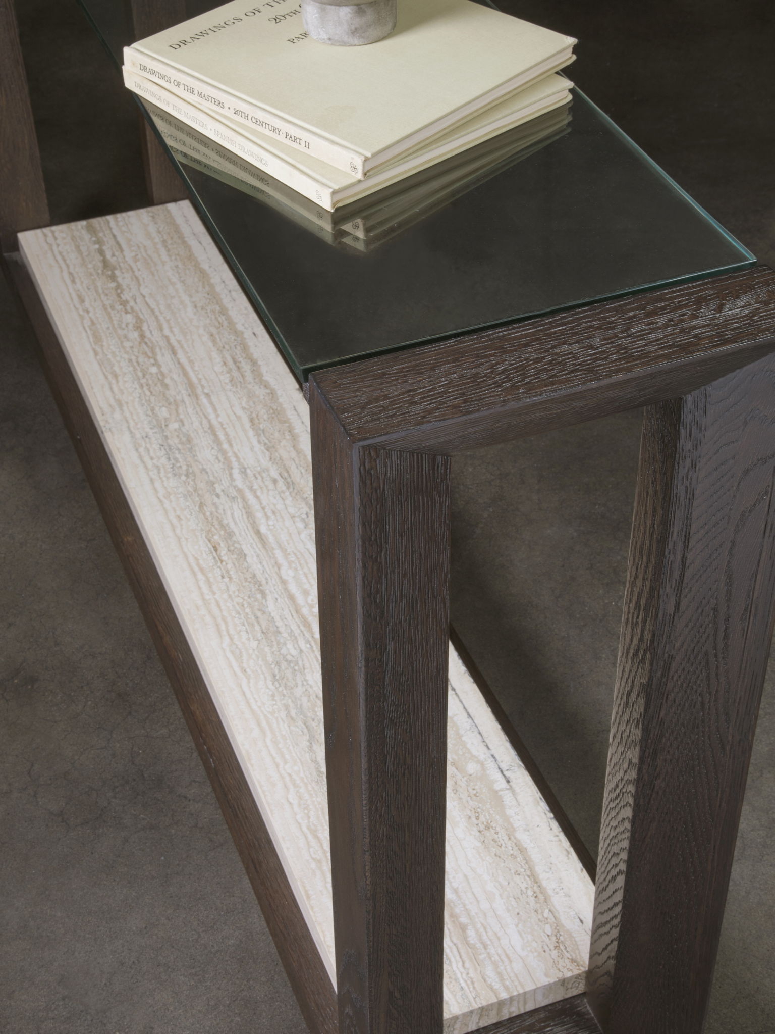 - Features An Inset Tempered Glass Top, A Fantasy Travertine Shelf, And A Recessed Plinth Base.