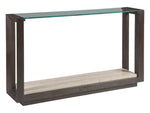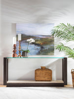 - Heavily Distressed Base, Inset Tempered Glass Top, Fantasy Travertine Shelf, Recessed Plinth Base