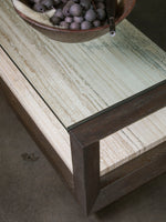 - Heavily Distressed Base, Inset Tempered Glass Top, Fantasy Travertine Shelf, Recessed Plinth Base