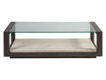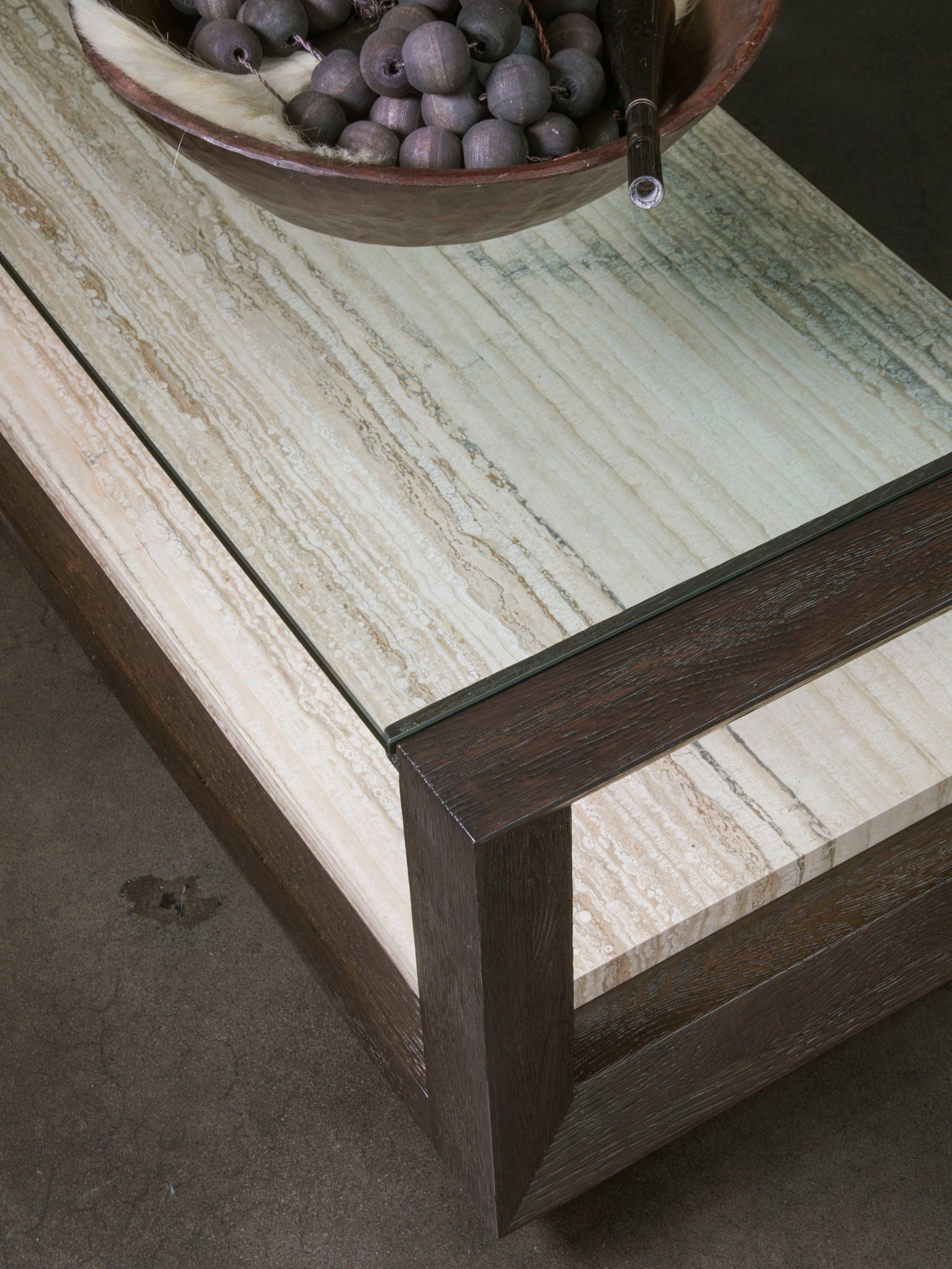 - Features An Inset Tempered Glass Top, A Fantasy Travertine Shelf, And A Recessed Plinth Base.