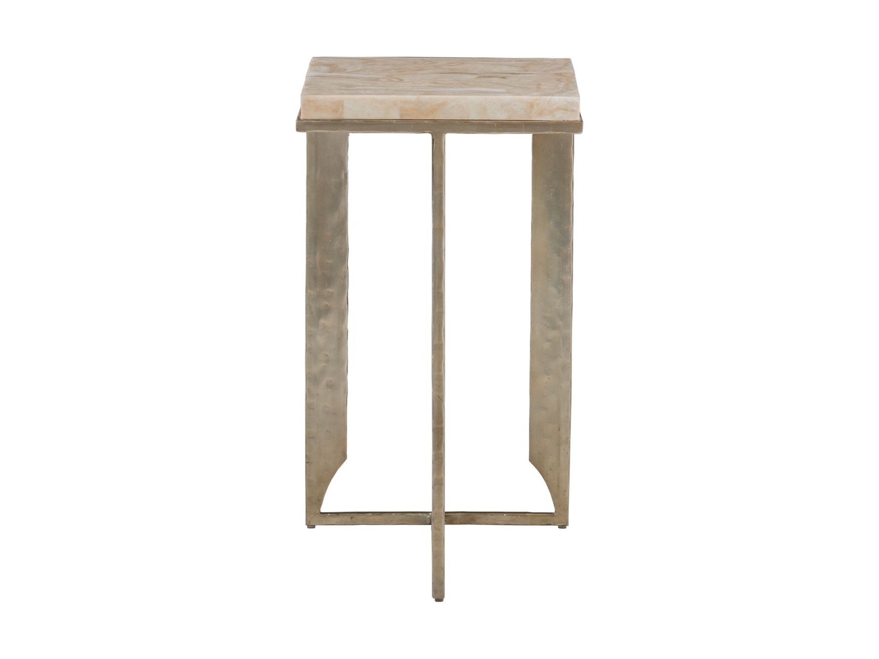 - Original Design In Hand-forged Iron Featuring Three Legs With Triangular Profies And Topped With Veneered Fossilized Wood Stone, A South Pacific Material With Onyx-like Qualities