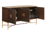 The 68-inch Tiburon sideboard makes a dramatic design statemen blending a tiger brown travertine top, statement hardware, and a hand-wrought artisan base, finished in gold burnished silver leaf