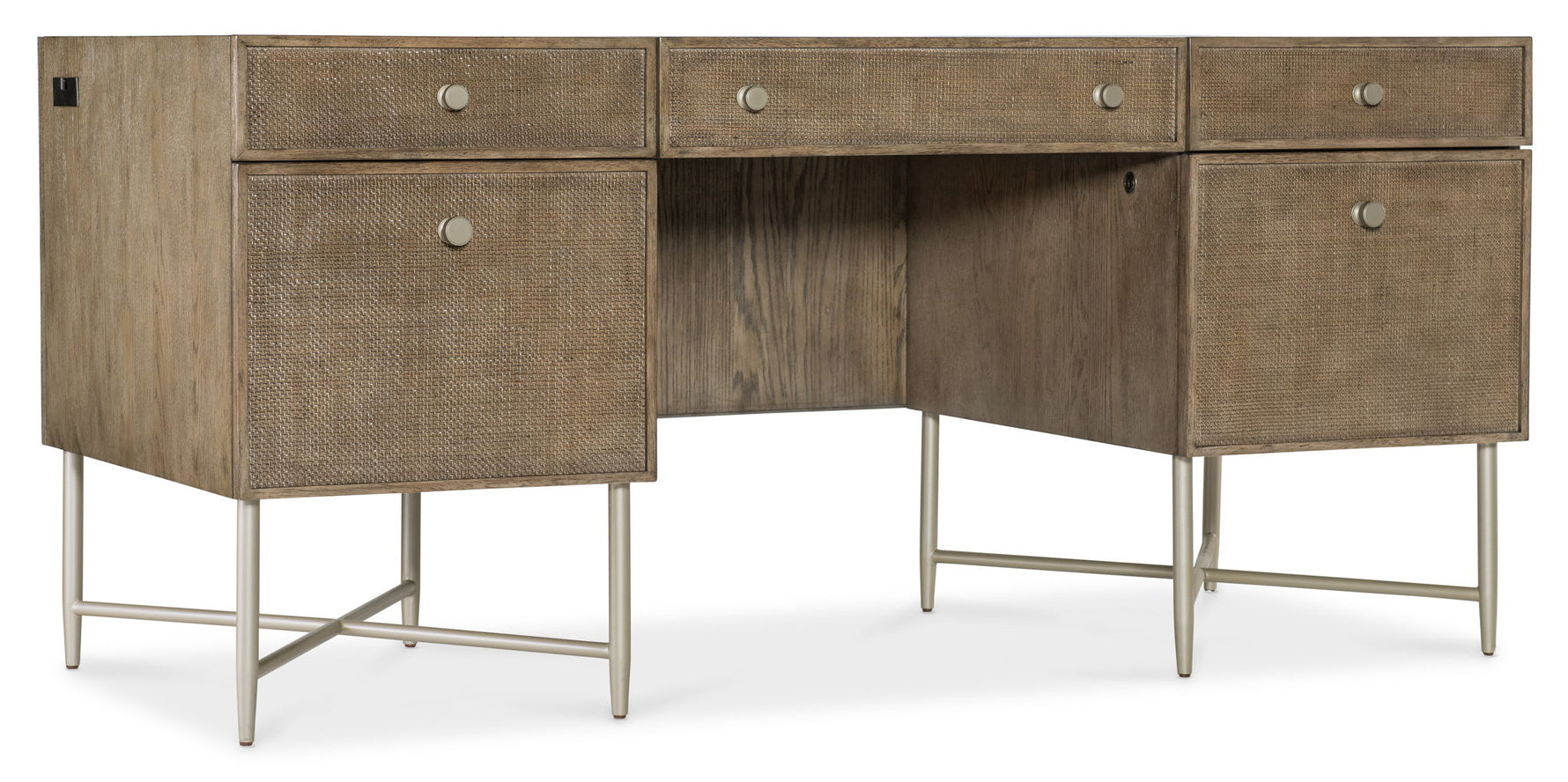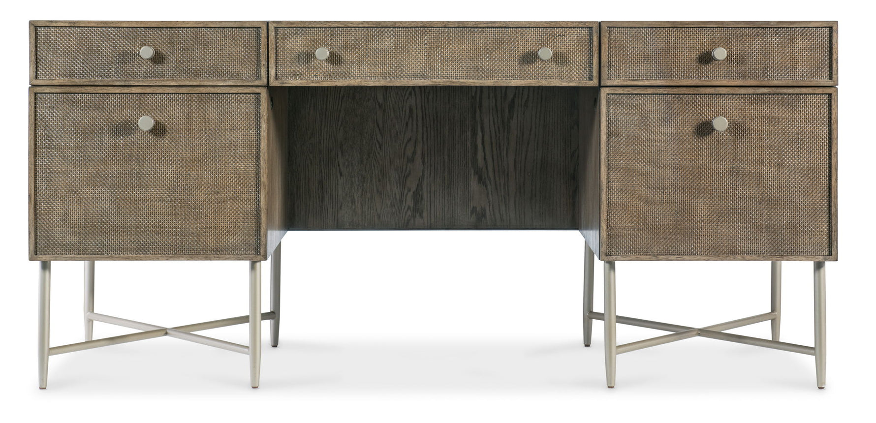 Unit price perMixing Quartered, Cathedral-Cut Oak in an earthen-toned finish with cane-front drawers and a metal base, stretchers and tapered legs, the Sonnet Executive Desk blends natural textures with a refined minimalist silhouette. The five drawers have cane-inset fronts, and there’s a removable/interchangeable writing surface and pencil tray that can be used in either the right or left top drawer. Each of the top side drawers has two removable partitions. The center drawer has a drop-front writing surface and wire management. Two locking file drawers have a Pendaflex letter/legal filing system.