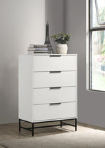 Create ample storage with the compact footprint of a modern four-drawer chest. Its roomy drawers are ideal for clothing, linens, and accessories, helping to keep your personal space tidy and organized. A white finish complements straight, clean lines, while black hardware adds contrast and depth. complementary metal base in black adds light, airy ambiance. Use the top for decor like photos, or add a jewelry box for a personal touch.