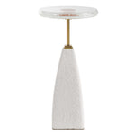 The Sora Drink Table Features A Thick Seeded Glass Top With A Complimenting White Sandstone Base And Brushed Brass Stainless Steel Accents.