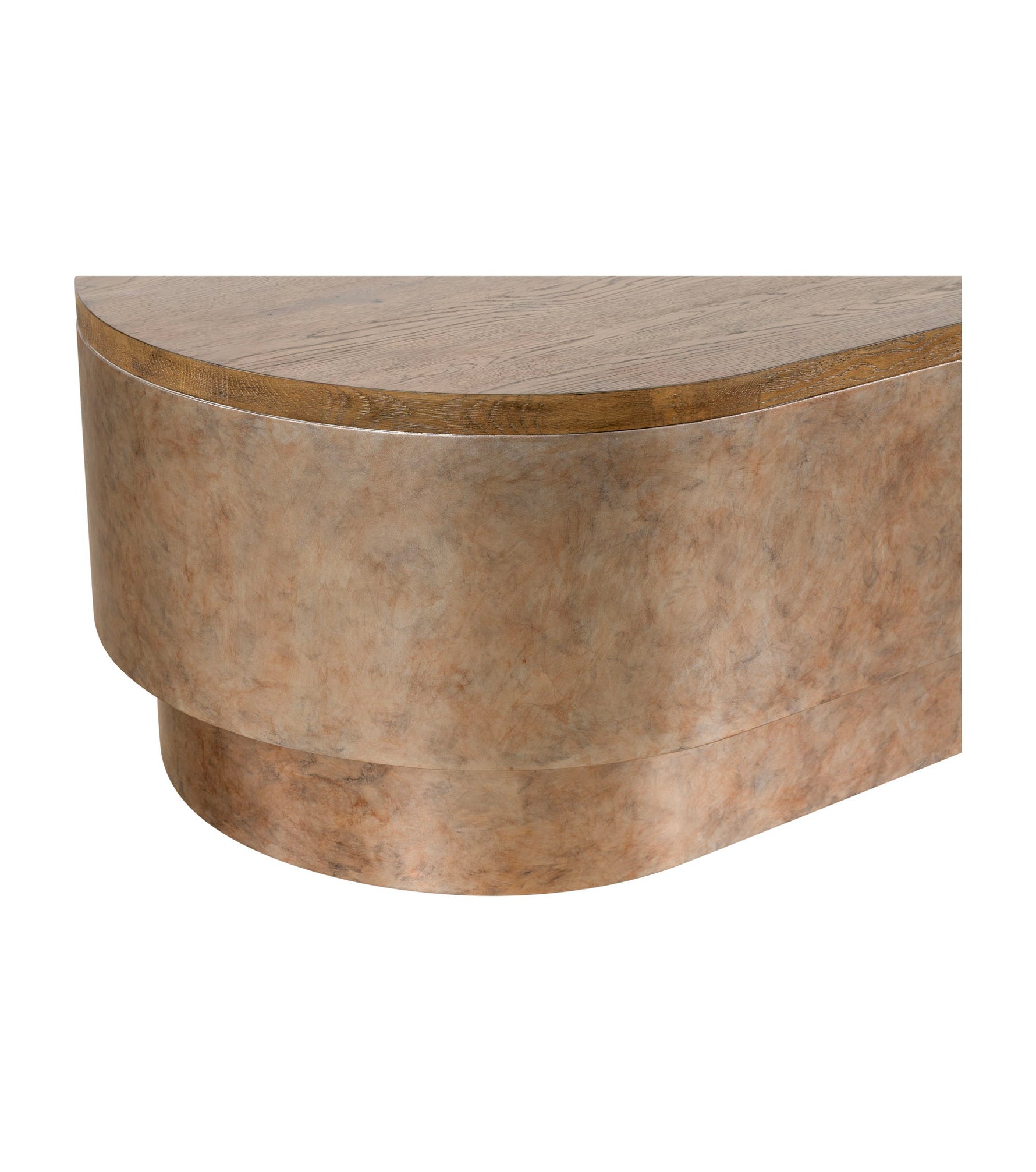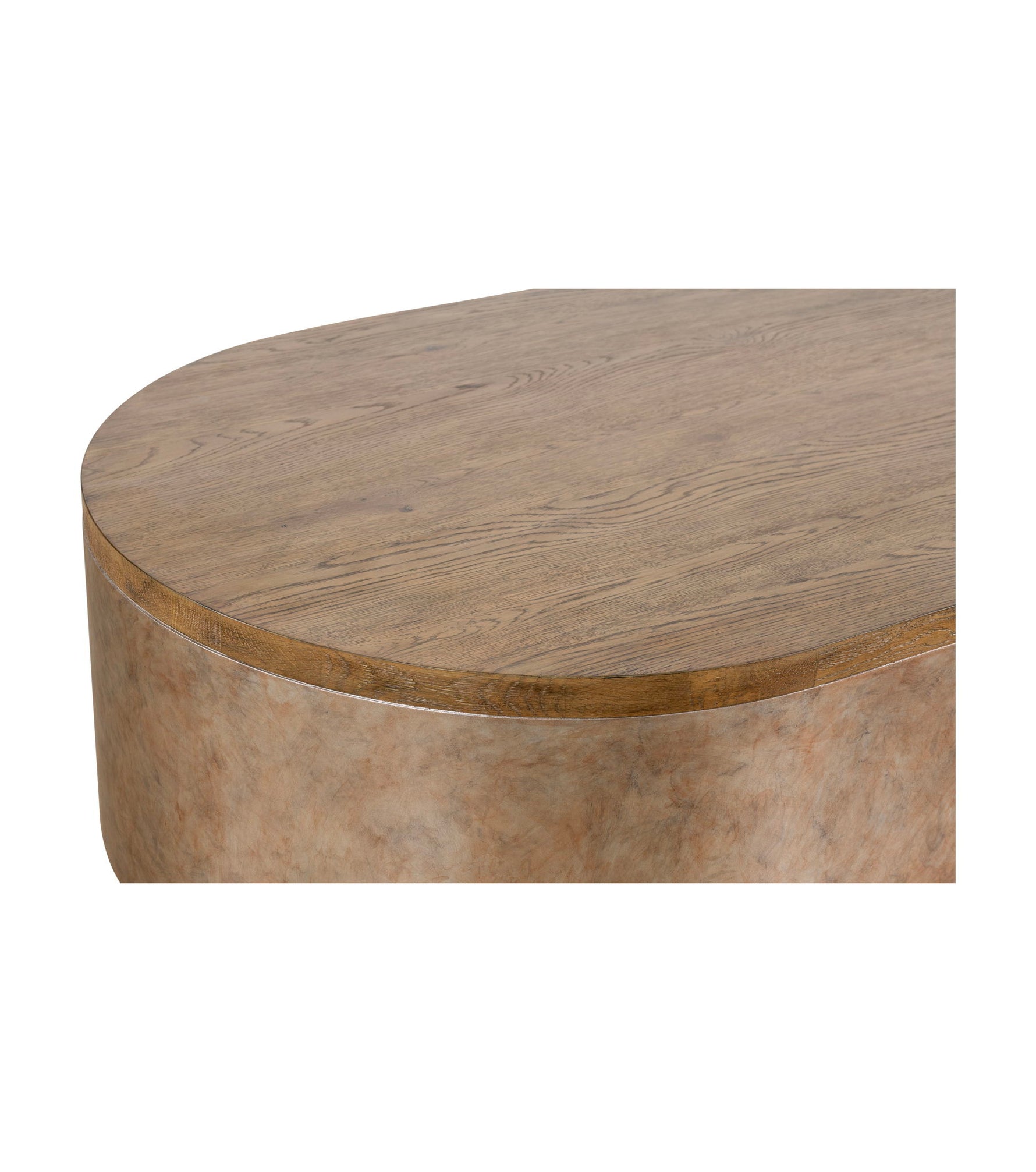 The Steele Coffee Table showcases a sleek, modern design that effortlessly combines materials and finishes. Its faux patinaed metal base contrasts beautifully with the warm, wire-brushed hickory veneer top, creating an eye-catching focal point. The distinctive pill-shaped design adds a unique touch, making it a standout piece in any living space. This coffee table not only enhances your decor but also offers functional surface space for books, drinks, and decor. With its contemporary aesthetic, the Steele Coffee Table is perfect for both casual and sophisticated settings.
