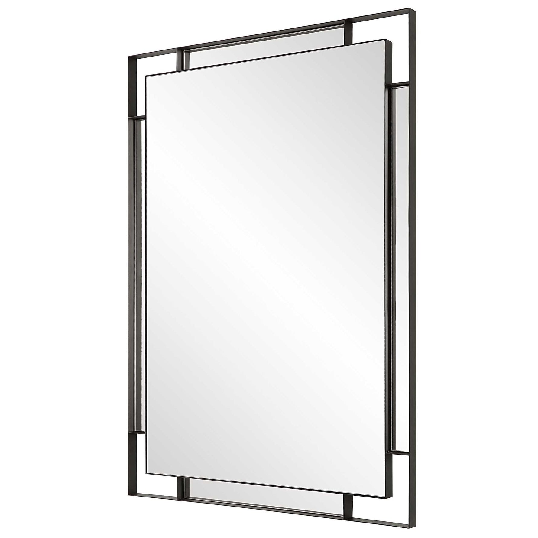 - The Stellan Mirror Features A Strap Style Frame Finished In A Sleek Matte Black Surrounding A Floating Polished Edge Mirror With Accompanying Side Mirrors For Added Visual Dimension.