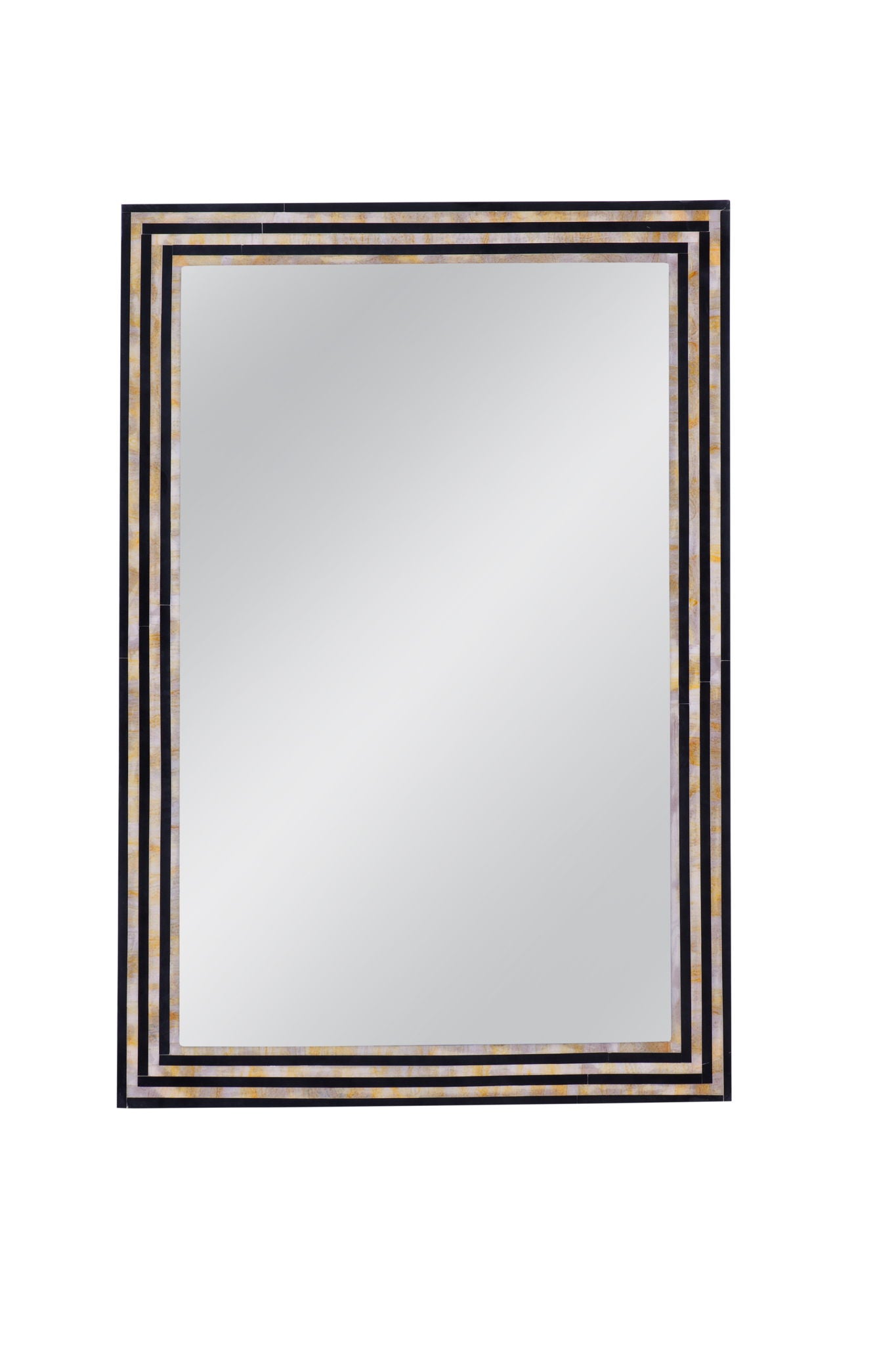 The Stepford Wall Mirror features a rectangular shape with a striped bone and resin frame in a stylish black and cream color combination. The modern boho aesthetics create a relaxed yet sophisticated vibe, making this mirror a versatile addition to various interior styles. The natural texture of the bone and resin adds depth and character, while the simple yet bold design enhances the overall look of your space. The Stepford Wall Mirror is perfect for adding a unique touch of elegance and charm to your home decor.