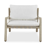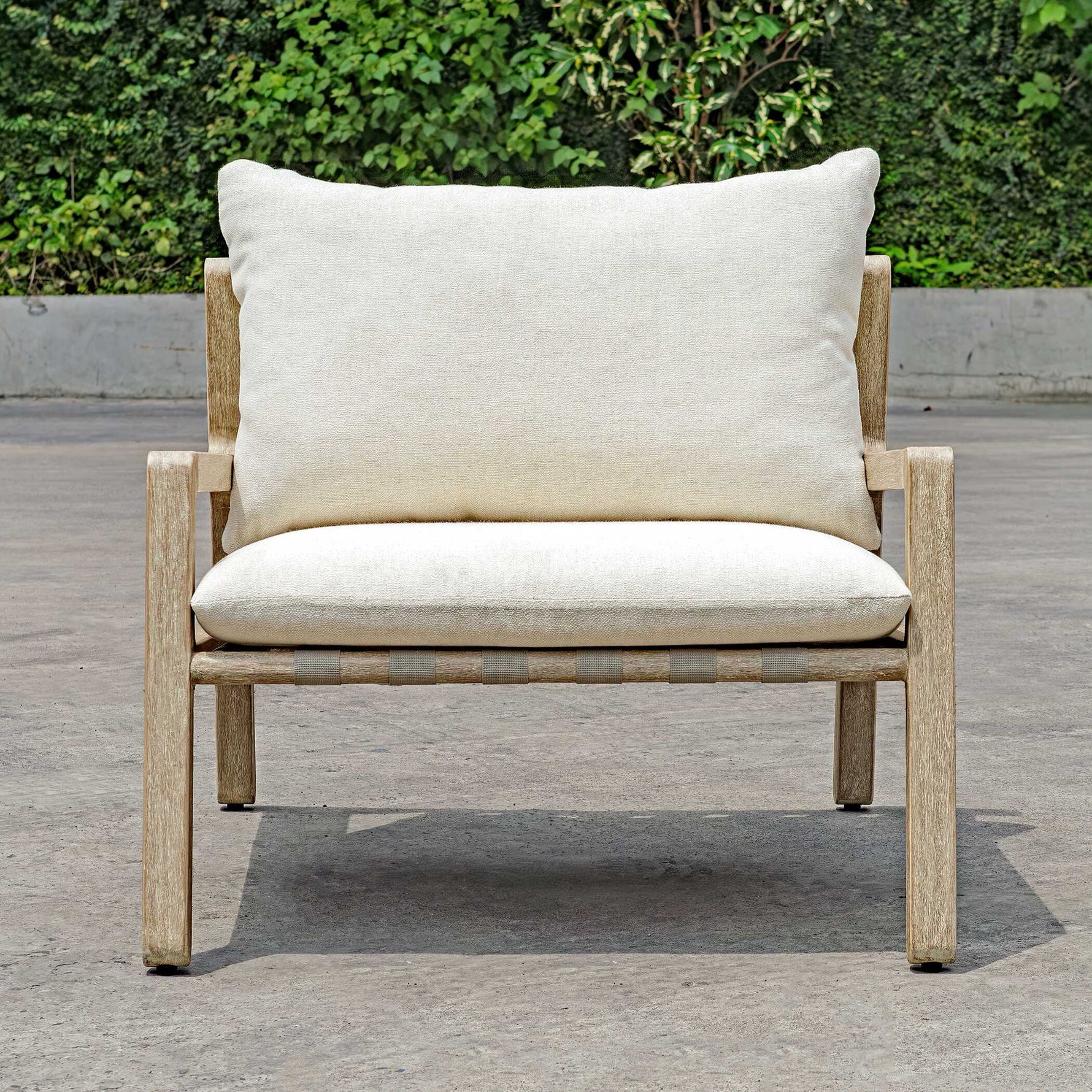 The Strapped Outdoor Lounge Chair Features A Casual, Laid Back Styling With A Mahogany Wood Frame In Cerused Wheat Accented With Taupe Back Straps Adding Function And Style. The Plush Cushions Are Upholstered In An Ivory Rattan Textured Sunbrella Solution Dyed Acrylic.