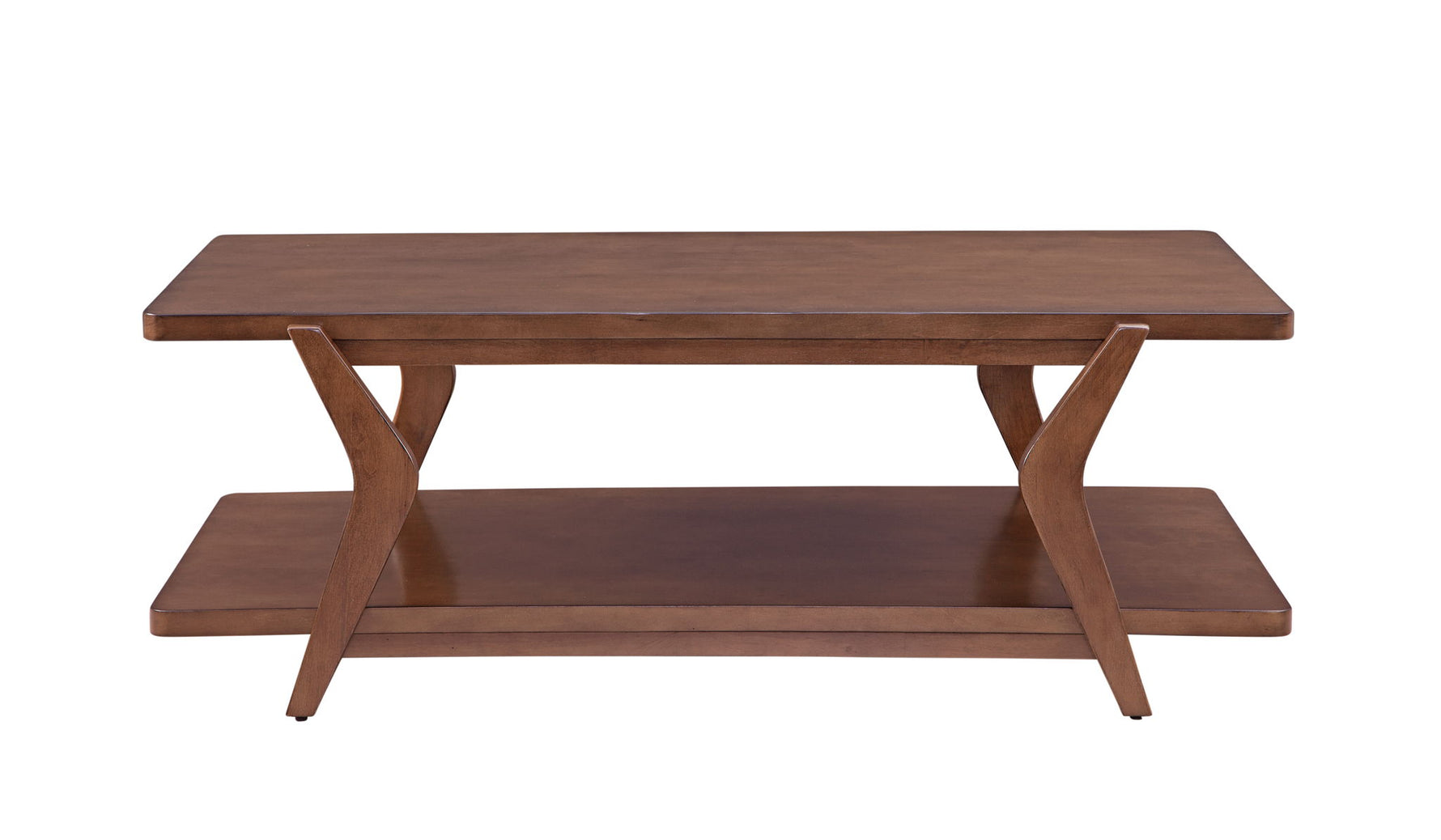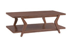 The Stratton Cocktail Table features a Mid-century modern influenced design. The architectural inspired silhouette features an angled frame and one shelf for storage. Finished in a rich brown walnut.