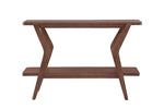 The Stratton End Table features a Mid-century modern influenced design. The architectural inspired silhouette featuring an angled frame and one shelf for storage. Finished in a rich brown walnut.