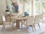 Offering a fresh interpretation of relaxed resort living, Sunset Key features clean architectural lines and a raised panel design that creates natural shadowing. White oak surfaces are gently wire-brushed to highlight the grain lines, and finished in a light Sand Drift coloration. Accent materials include ultra-clear wavy glass, honed travertine, and metal elements in a brushed champagne finish for a clean contemporary look.
