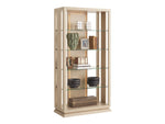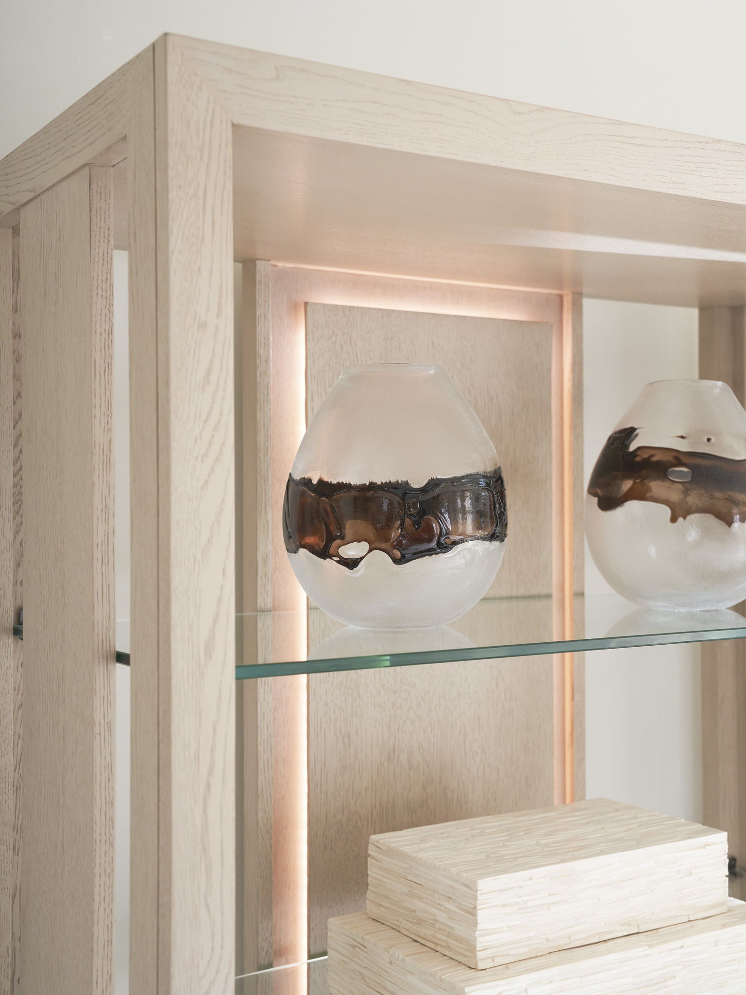 - Four Adjustable Tempered Glass Shelves And Open Decorative End Panels. Canted Plinth Base Offers A Floating Appearance. A Full-length Back Panel Features Recessed LED Lighting Around The Entire Perimeter. The Touch Dimmer Switch Is Located On The Right-facing Back Post.