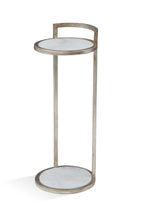Metro modern styled martini table is perfect chair side accent. Features white marble inserts and a silver leaf frame.