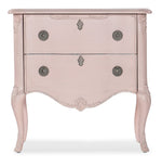 Feminine and French, the Flourish Accent Chest is an exquisite silhouette with cabriole legs and elegant carvings.  Part of a curated collection to honor the journeys of those affected by breast cancer, the light distressed pink finish of the chest is accented by satin nickel decorative ring pulls and faux lock backplates, and the two drawers have pink interiors. A portion of the proceeds from each chest sold goes to the Susan G. Komen foundation to benefit breast cancer research.