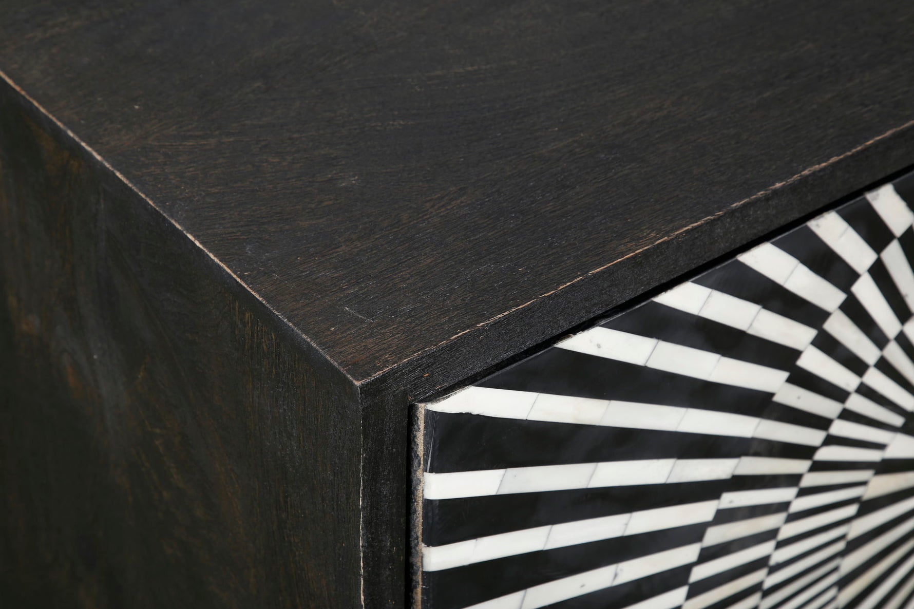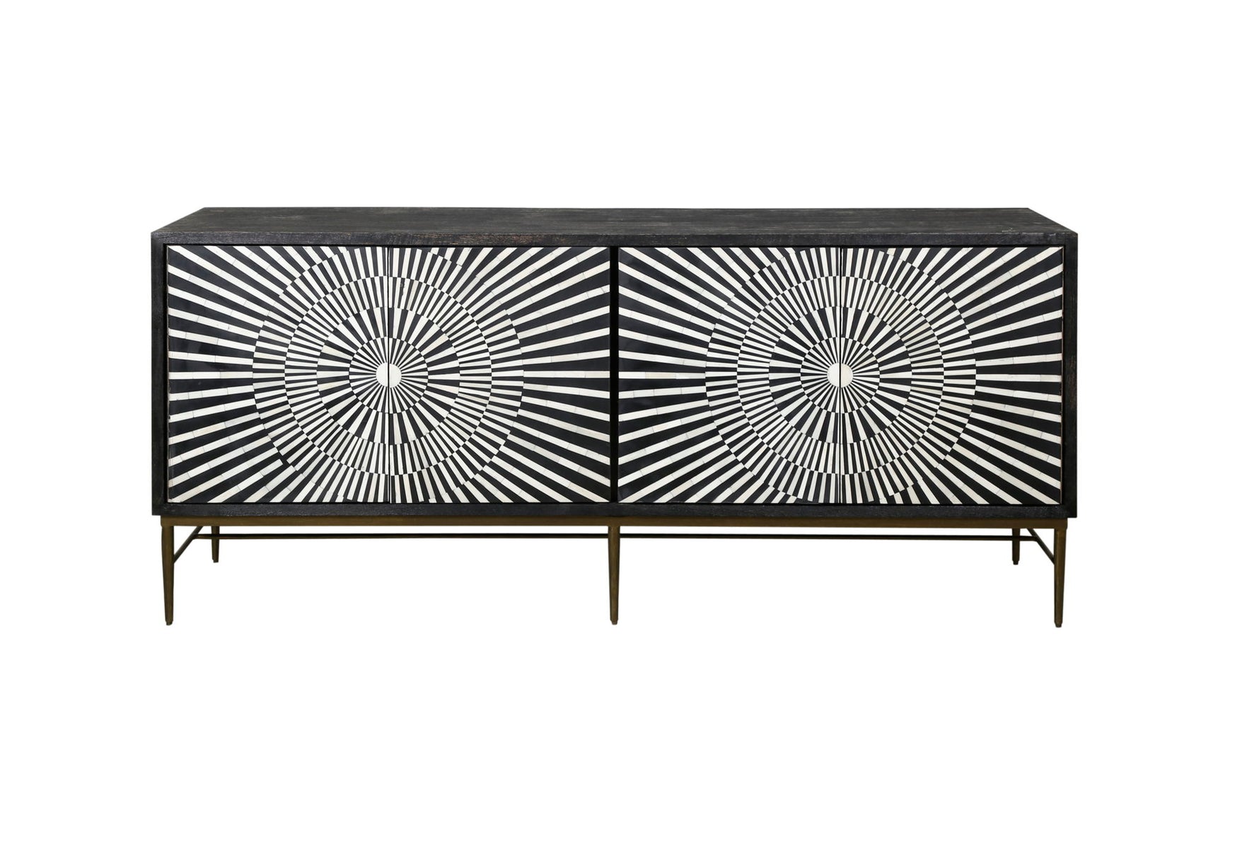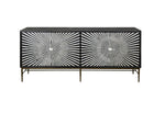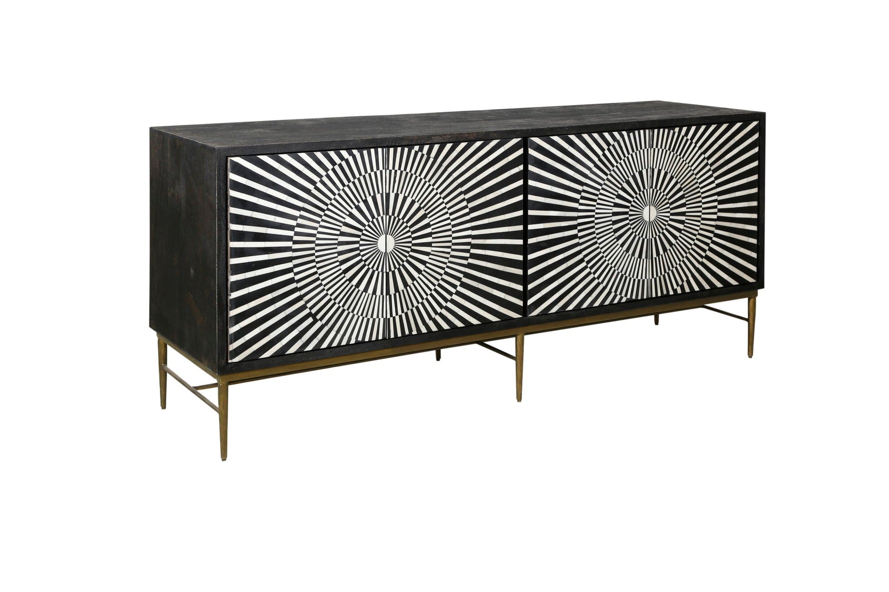The Talley Server is a true testament to modern Boho design, drawing inspiration from a captivating blend of contrasting elements. Its four doors, adorned with alternating white and black stained bone and resin, come together to create a striking sunburst pattern. The outer frame, crafted from solid mango wood, adds a tactile quality through sandblasting and is elegantly finished in antique black. The server rests on a sleek brass-finished iron base, and its doors open with a gentle push to reveal two shelves and cord management cutouts. The Talley Server combines style and function, adding charm to your home decor.