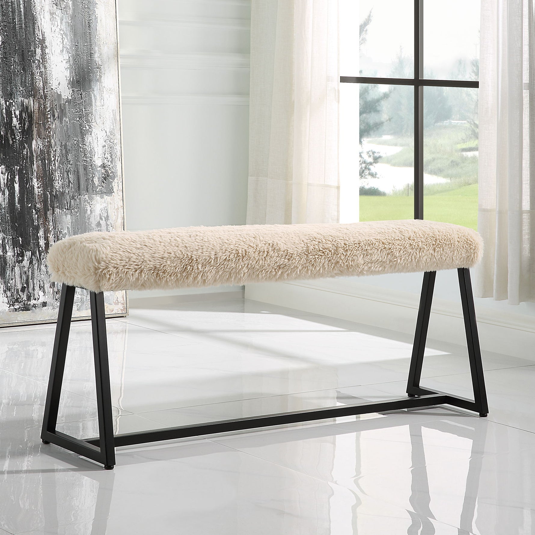 - A Space Saving Seating Solution Featuring A Slim Bench Seat Upholstered In Plush Long Haired Faux Sheepskin In A Toasty Beige Over A Matte Black Finished Iron Base. Seat Depth Is 8".