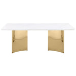 Instill a sense of luxury with this striking contemporary dining table, featuring a genuine white marble table top. The rectangular table, constructed with engineered marble veneer, china white marble, and MDF, comfortably seats friends and family, offering a fresh, modern look. Brimming with elegance, the table showcases the white marble to perfection, allowing its natural veining to create a rich, refined character. Adding a touch of glamour, the table is supported by a double pedestal base, each pedestal being a curvy, three-sided structure made of champagne gold stainless steel. This stunner is an exceptional focal point in any sophisticated dining room.