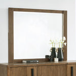 Offer a tailored touch to your bedroom with a modern framed dresser mirror. It mounts directly to the back of the dresser, offering reflectivity and lightness to surrounding decor. The mirror frame boasts a cool ash brown wood finish and features vertical fluting on its left and right sides. Beveled glass creates dimensionality and offers a refined touch of style. Add decor to complete the look of your stylish dresser.