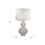 The Thayer Table Lamp features a curve base made of glass with a crystal base and a white tapered shade.