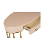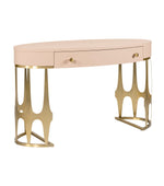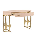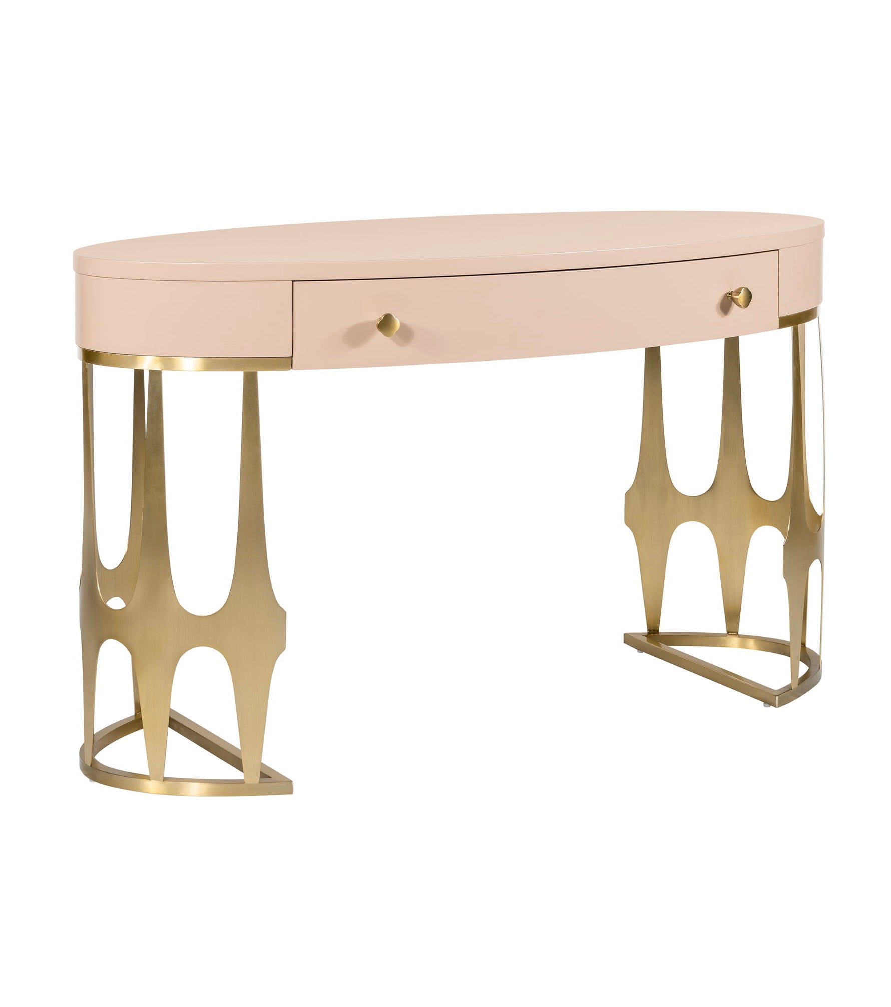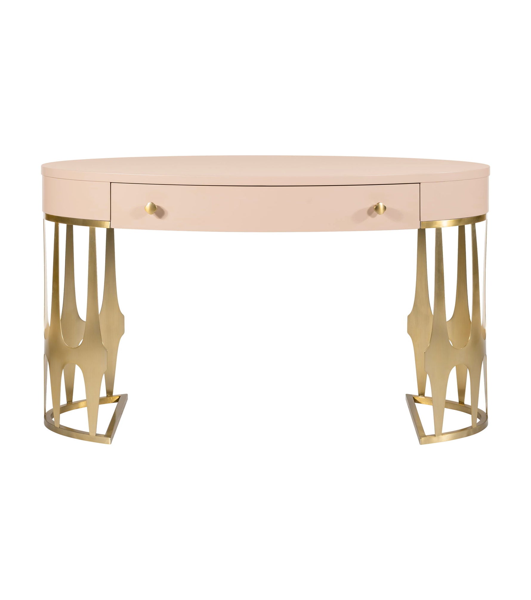 The Autograph Desk offers a dramatic contemporary design with a sophisticated mix of materials. The oval-shaped desk top is crafted from solid wood in a neutral taupe painted finish, providing a refined, versatile look. The curved base is made of precision-cut metal in a sleek brushed gold finish, adding an element of elegance. The single drawer features full-extension side-mounted guides and is accented with two shaped hardware pulls in coordinating brushed gold, combining both style and functionality in one stunning piece.