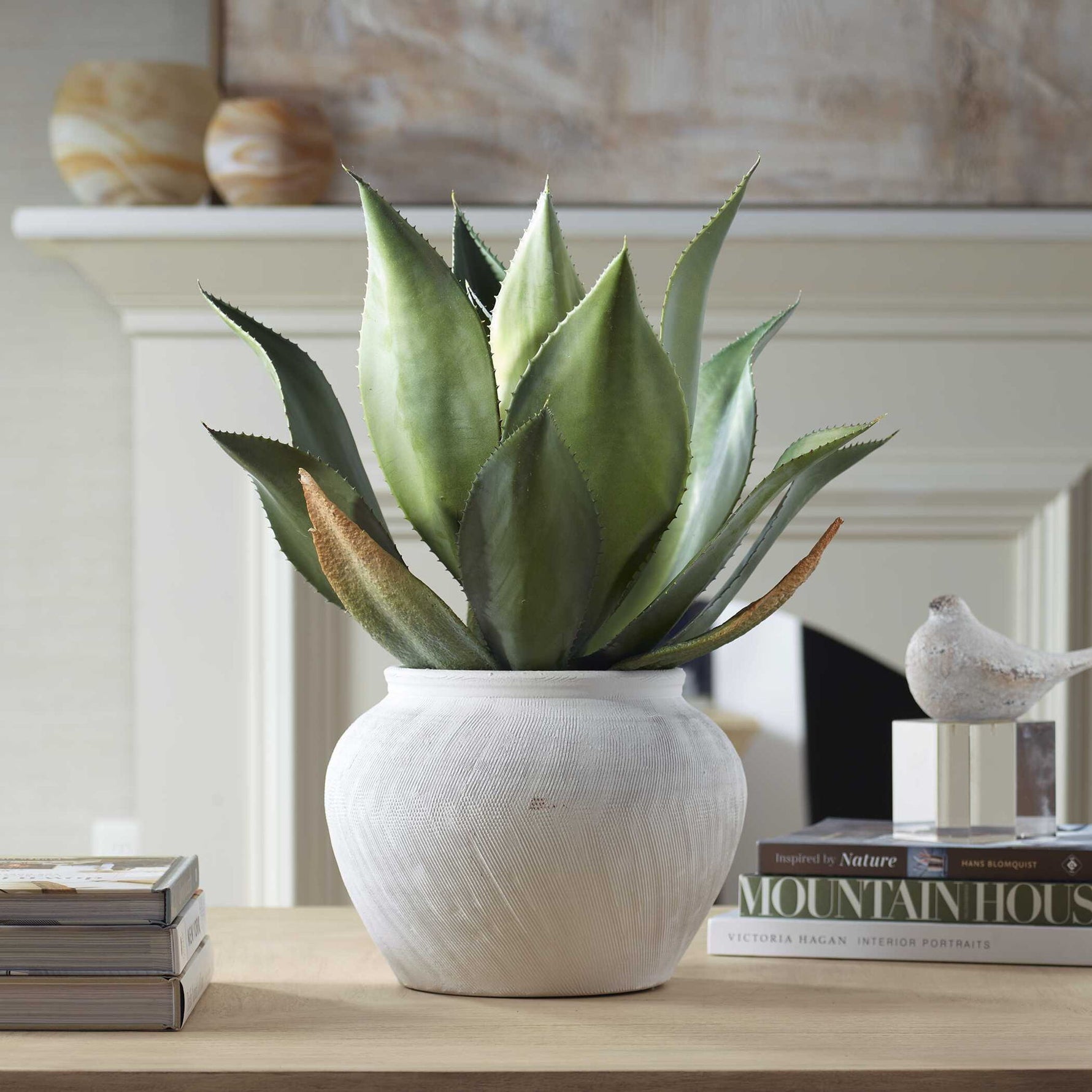 - A Stunning Life-like Agave Is Paired Perfectly With An Off-white Sculptural Vase Displaying An Organic Etched Texture.