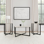 Elevate your living space with this stunning coffee table set, merging modern style with luxurious materials. Each piece features a genuine white marble top, detailed with elegant gray veining for timeless sophistication. The sturdy black powder-coated solid metal frames showcase crisscross bases, delivering a bold, architectural aesthetic. Straight edges and clean lines complete the minimalist yet striking design. Perfect for glam, industrial, or contemporary interiors, this occasional table set transforms any room with refined charm.