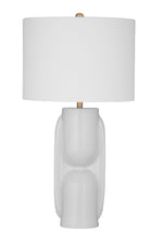 The Tolland Table Lamp boasts a modern geometric shape that adds a contemporary flair to any space. With its glossy white finish, it exudes a sense of freshness and sophistication, effortlessly blending into various decor styles. This stylish lamp not only illuminates your room but also serves as a chic accent piece. Its clean lines and sleek design make it a versatile addition to any home or office environment. Illuminate your surroundings with the Tolland table lamp and elevate your interior with its understated elegance.