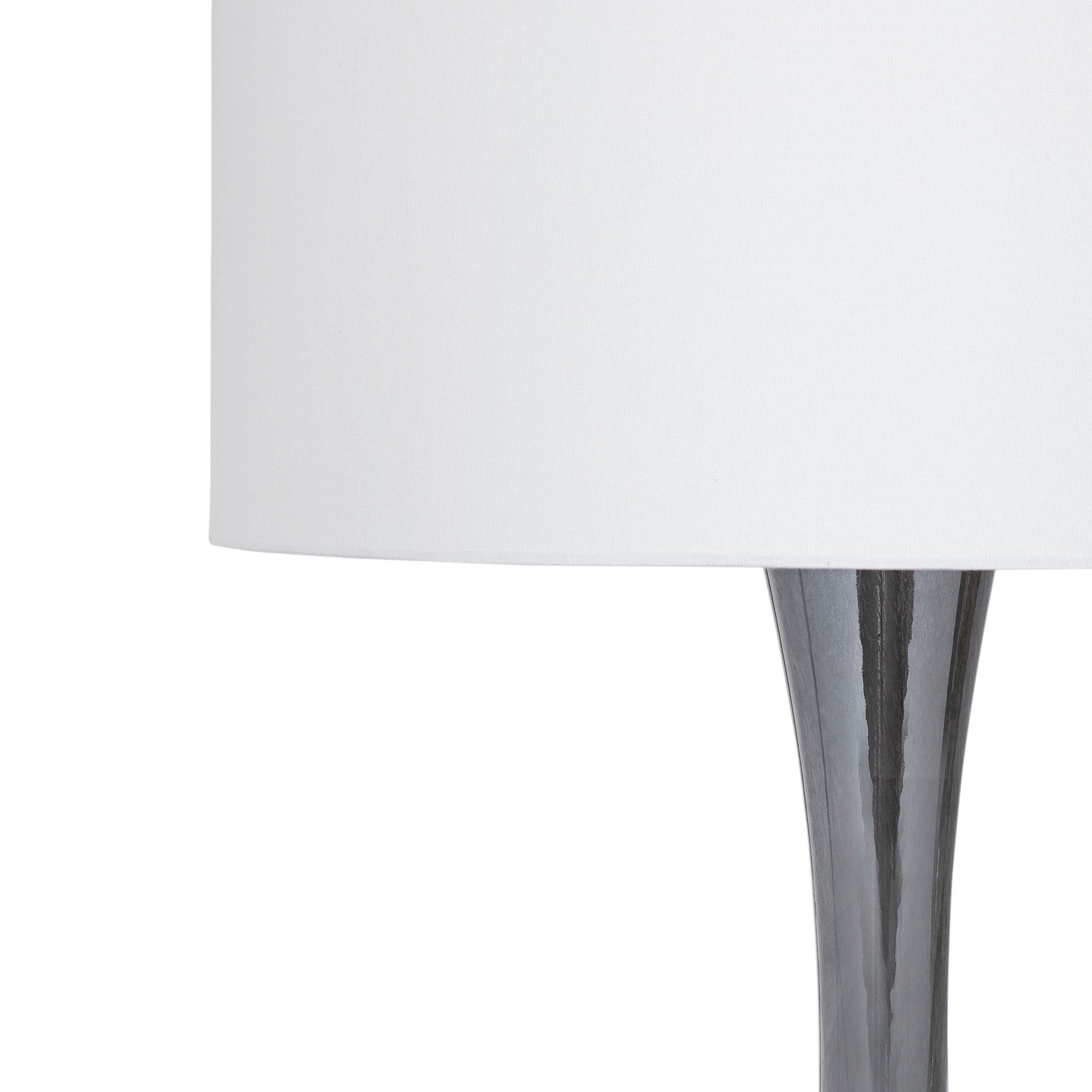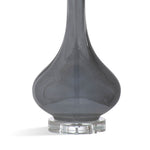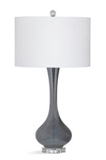 The Trey Table Lamp is crafted of art glass with a crystal base and a white drum shade. Lamp body is finished in a luster gray.