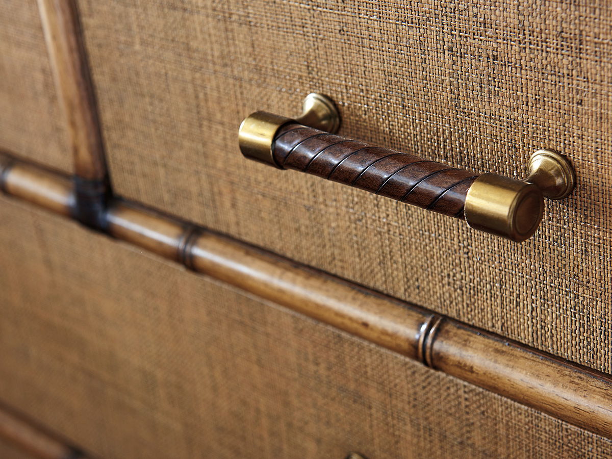 - Highly Versatile, The 4-drawer Chest Features Leather-wrapped Bamboo Carved Moldings, A Raffia Top, Drawer Fronts And End Panels And A Protective Glass Top