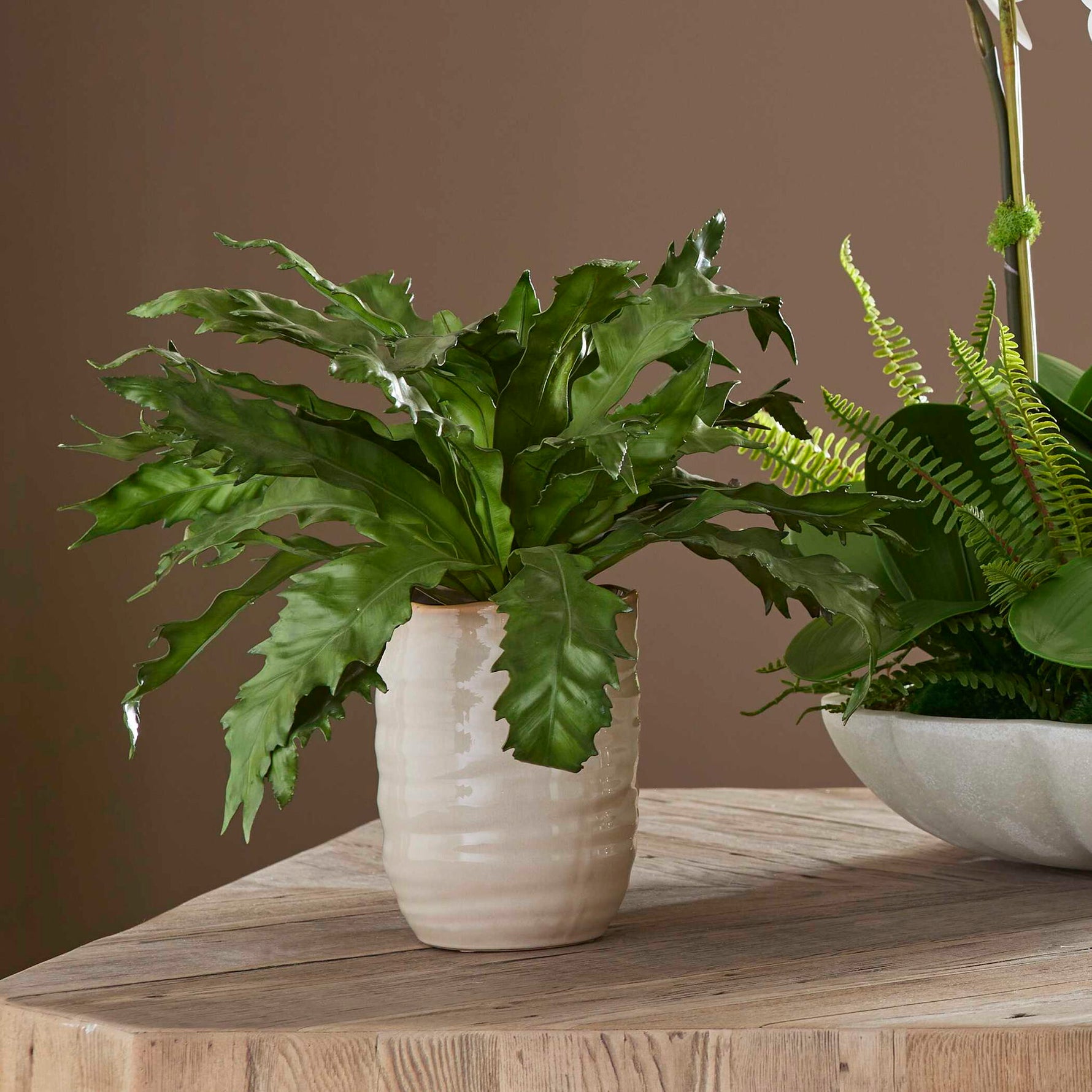 - Lush Sprays Of Rich Greenery, The Bird's Nest Fern Is A Symbol Of New Beginnings. Planted In A Textured Tan Glazed Ceramic Pot.