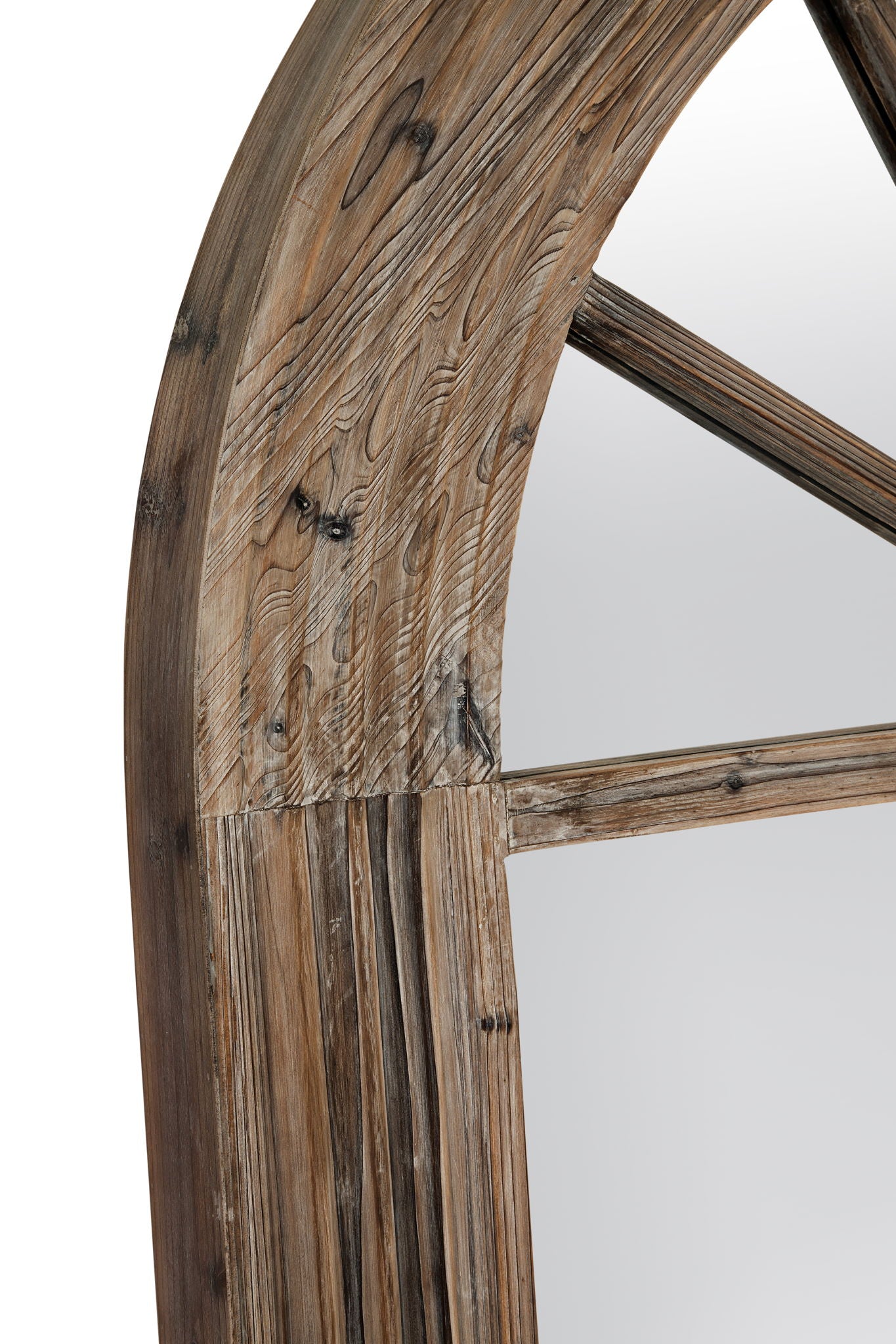 The View Floor Mirror offers a charming window-like design with its arched shape, adding rustic elegance to any room. Crafted from solid wood and finished in a weathered gray-brown hue, this mirror exudes warmth and character. Perfect for creating a cozy atmosphere, it effortlessly enhances the aesthetic of your living space while providing a functional accent piece.
