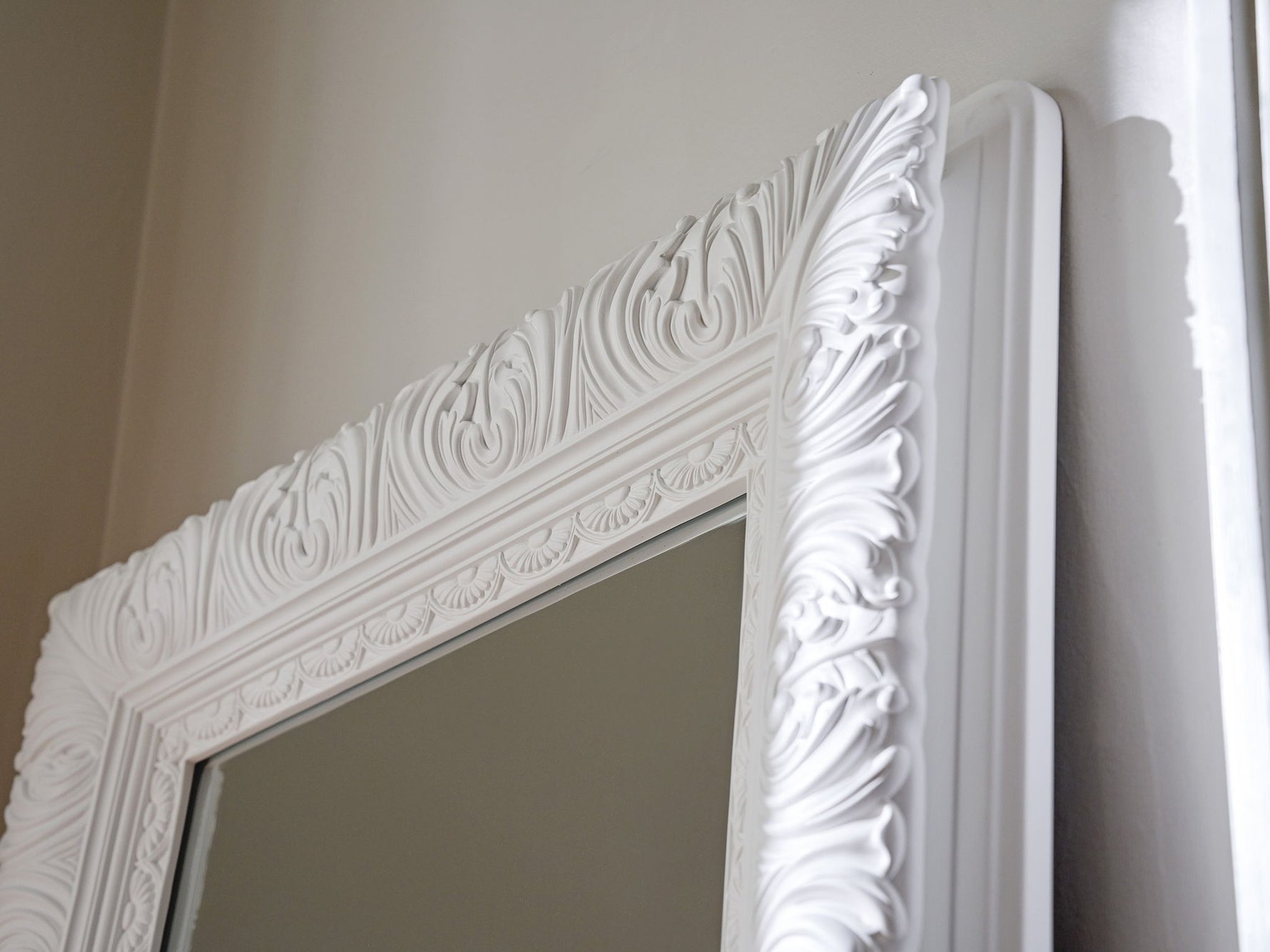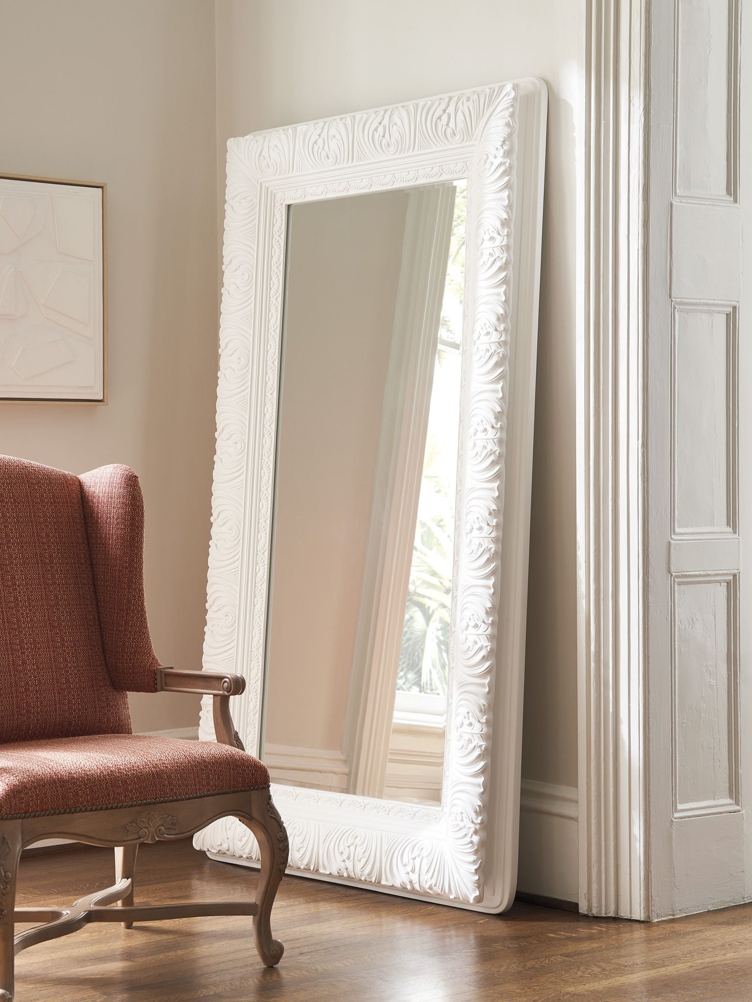 - The Alicante Floor Mirror Stands 82-inches High. Its Picture Frame Design Features An Elegant Acanthus Leaf Pattern Around The Perimeter And A Mirror Plate With A 1-inch Bevel.