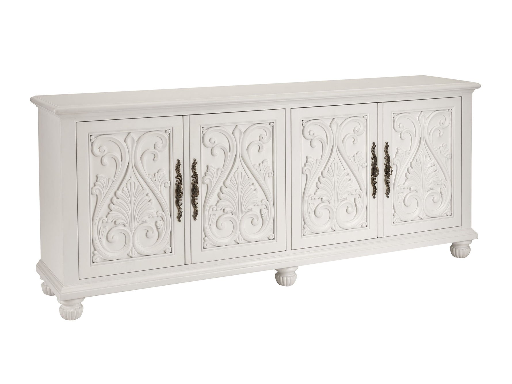 - The Catalonia Media Console Features Bold Carved Overlays On The Four Door Fronts, And Fluted Bun Feet. There Are Two Adjustable Shelves Behind Each Pair Of Doors. The Back Panel Is Both Ventilated And Removable.