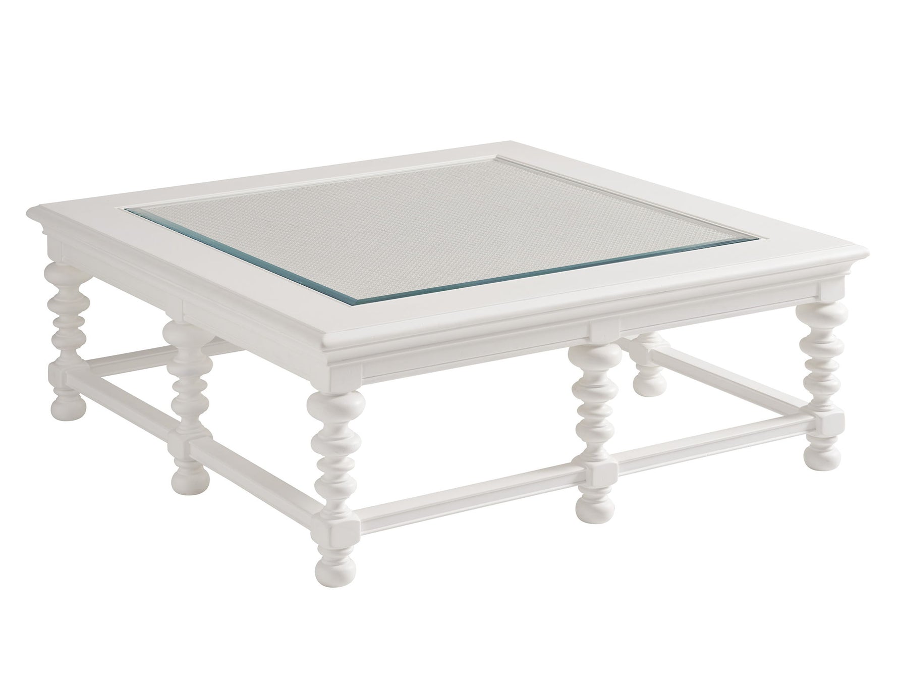 - The Cyprus Cocktail Table Features A Tempered Ultra-clear Glass Top With 1-inch Bevel Over Decorative Cane. The Eight Turned Legs And Bun Feet Are Joined By A Decorative Stretcher.