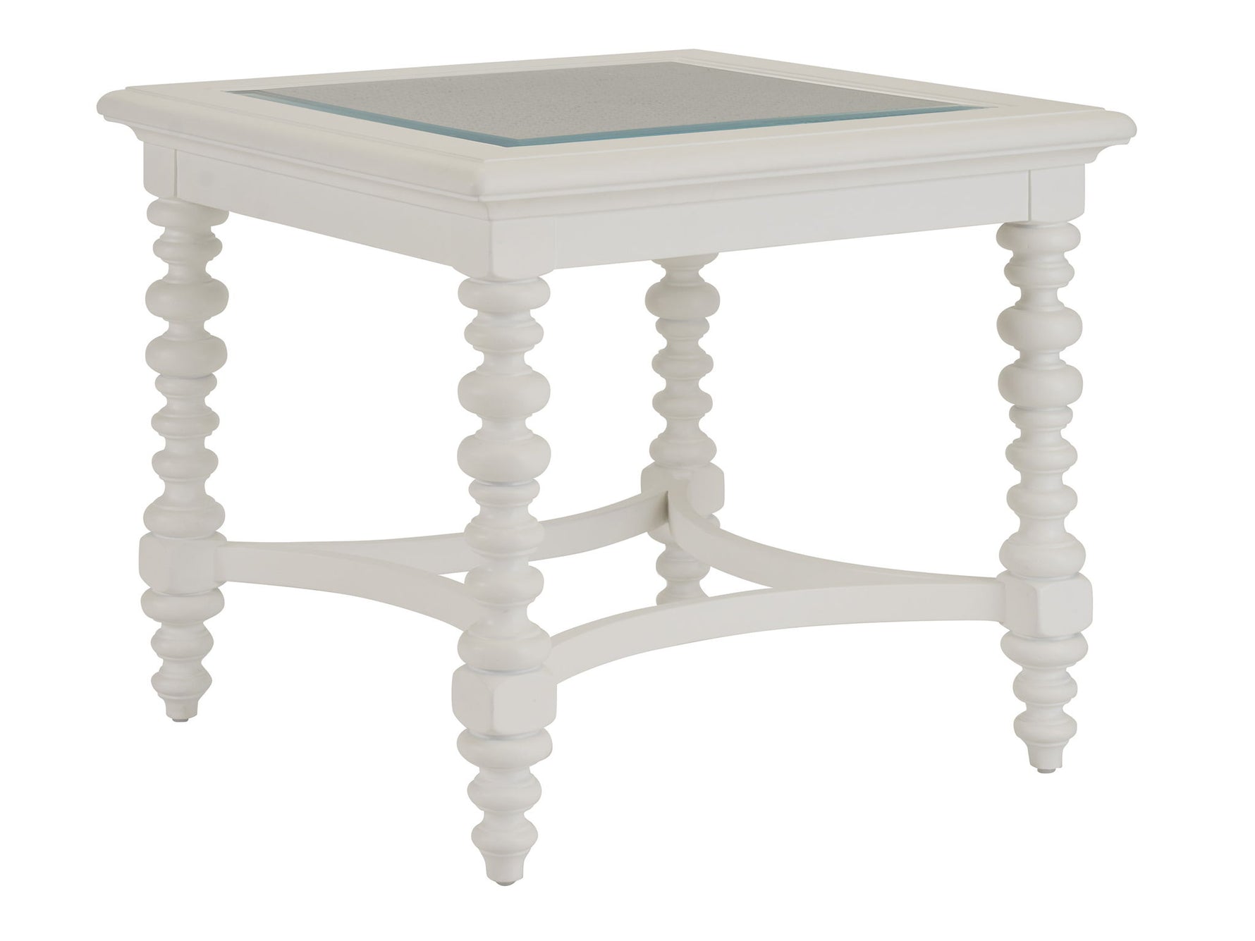 - The Cyprus End Table Features A Tempered Ultra-clear Glass Top With 1-inch Bevel Over Decorative Cane. The Turned Legs Are Connected By A Graceful Concave Stretcher Design.