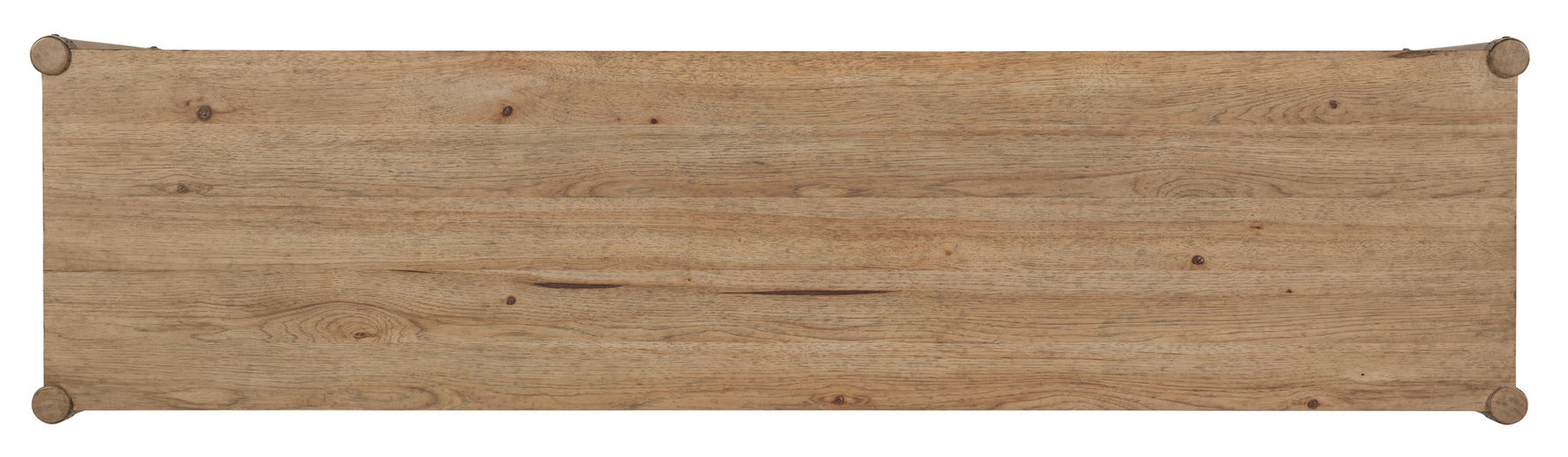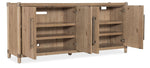 Unit price perCapture the essence of the Napa Valley feeling with the Vineyard Row Entertainment Credenza. Combining Pecky Hickory Veneers with visible knots and rustic hammered metal accents, it is finished in the light-and-airy Sonoma hue. The credenza features 4 doors with soft-close hinges and magnetic catches, two adjustable wood shelves behind each pair of doors and a ventilated back panel and wire management behind each pair of doors. Accommodates up to a 75-inch TV.