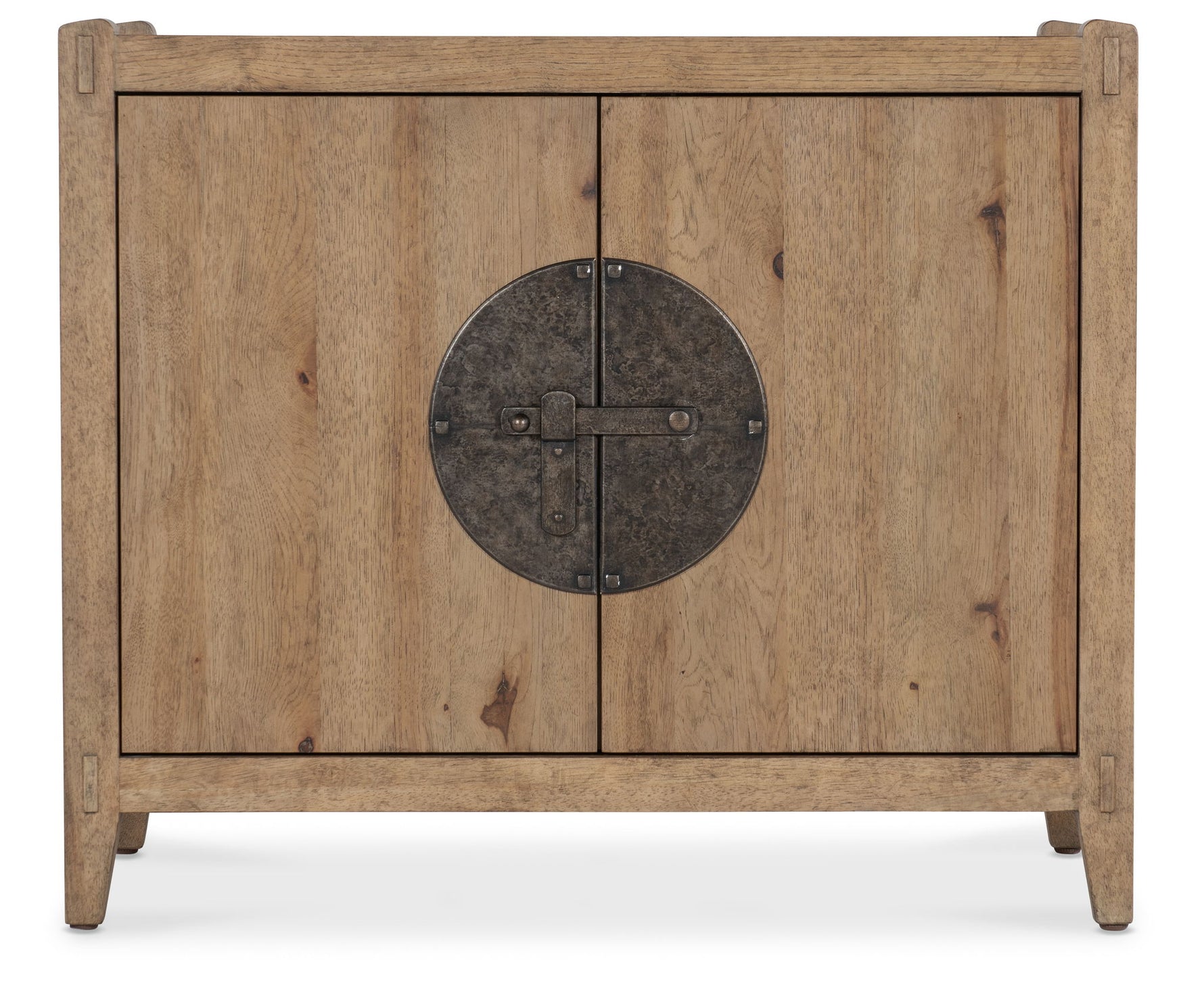 Unit price perEmbracing the rustic charm, organic aesthetic and craftsman architecture of the Napa Valley, the Vineyard Row Two-Door Nightstand has two doors with soft-close hinges and a large circular rustic hammered metal backplate. Featuring one shelf behind the door that creates two storage areas, it is crafted or Pecky Hickory Veneers and finished in the light-and-airy Sonoma.