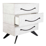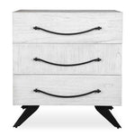 - The Vivi Three Drawer Chest Features A White Finish With Black Iron Accents. Displaying Alternating Mindi Veneer Directions Giving It A Playful Element, While The Wide Black Hardware And Matching Legs Add To Its Contemporary Look. Has Soft Closing Drawer Glides.
