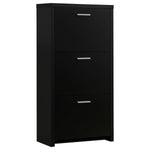 This modern shoe cabinet features a sleek black finish and a space-saving design ideal for compact entryways or closets. Constructed from engineered wood with a scratch-resistant and eco-friendly laminate veneer, it includes three flip-down compartments, each with two tiers of internal shoe storage. Chrome-tone handles and a streamlined silhouette enhance its contemporary appeal while keeping footwear organized and accessible.