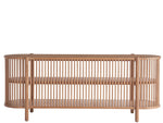 The Weekender Console introduces depth and intrigue into spaces with three fixed, open-air shelves framed by a series of vertical wooden decorative posts.