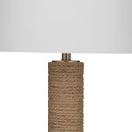 The Welch Table Lamp features a base wrapped in natural fibers with a white drum shade.