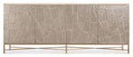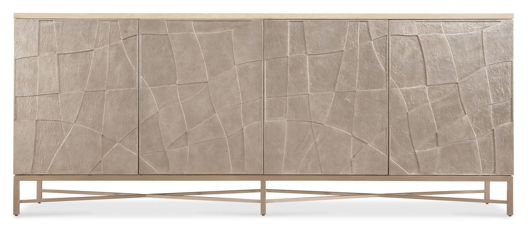 Unit price perBring a touch of "quiet luxury" to your home with the Westwood Credenza. The Polished Limestone finish on quartered oak veneers, paired with Venetian Dawn silver-leaf décor on the door fronts, creates a captivating blend of texture and color. This credenza features four doors with touch latches, each hiding an adjustable shelf and two drawers. A ventilated back panel and wire management cutouts make it ideal for entertainment purposes, while the metal base with an X-shaped stretcher adds a sleek, modern finish to the overall design.