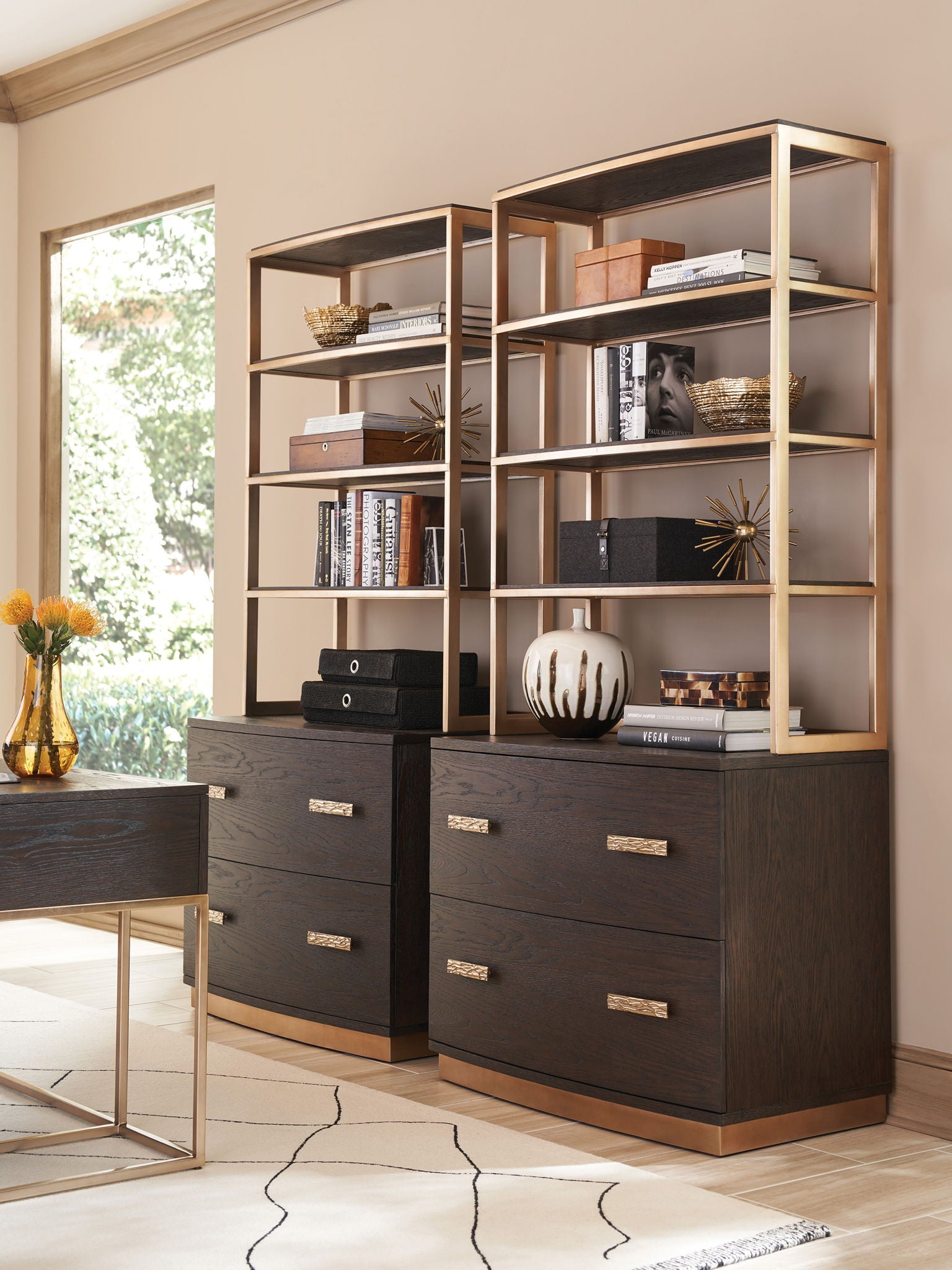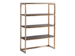 - Metal Frame In A Warm Silver Leaf Finish, Three Stationary Wooden Shelves, Open Back And End Panels. Complements The -450 Carson File Chest.